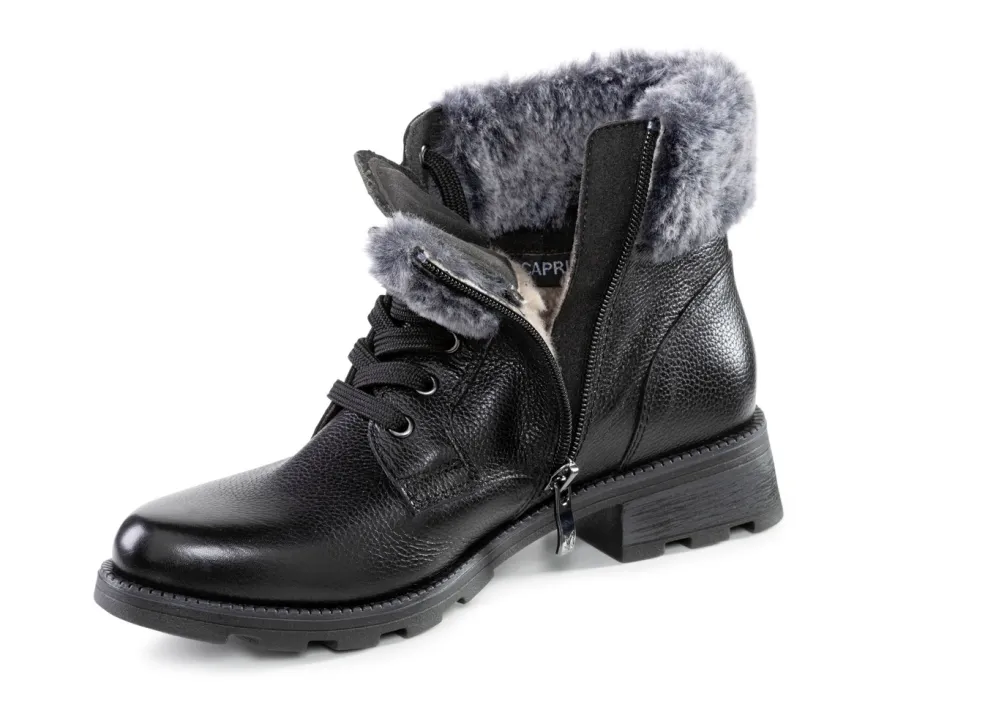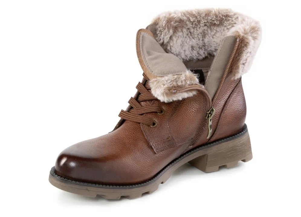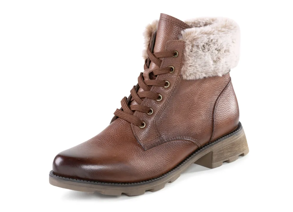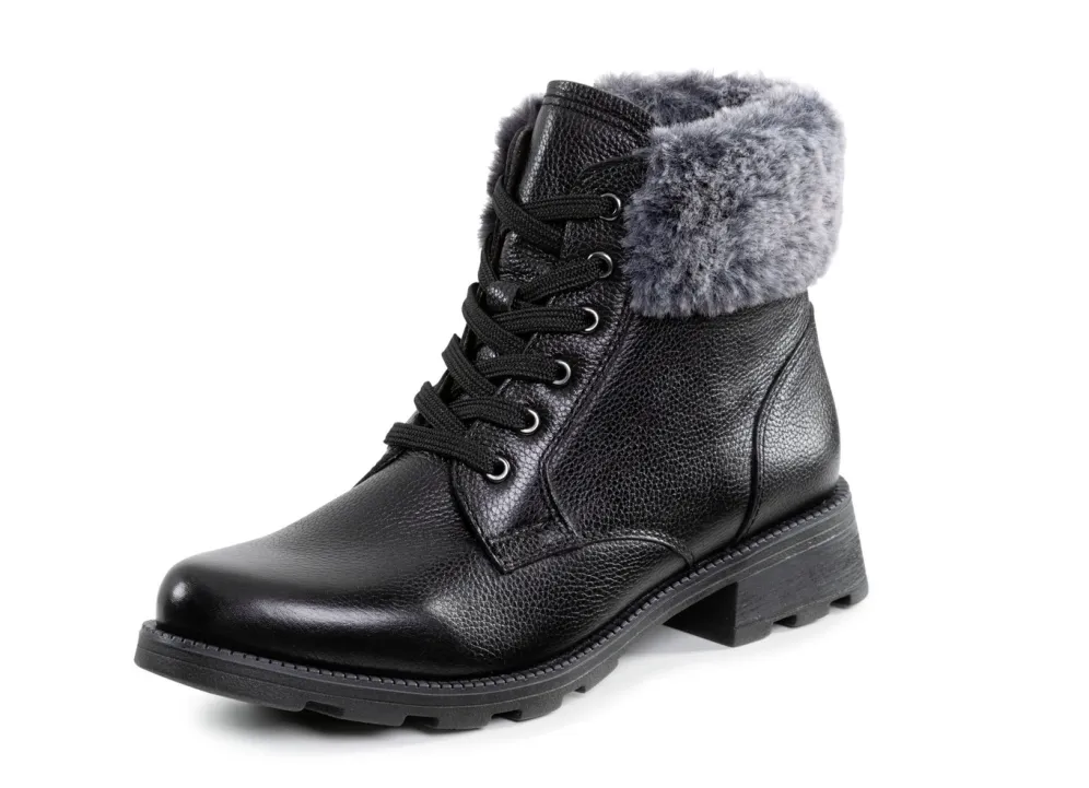 Stiefeletten von ELENA EDEN, aus genarbtem, teilweise schattiertem Nappaleder, mit flauschigem Plüsch-Kragen und Innenreißverschluss: Weite G, mit Klimamembrane ausgestattet, Warmfutter aus 100% Polyester, herausnehmbares Fußbett, TPR-Profilsohle sowie 25 mm Absatz. Schafthöhe ca. 14 cm
