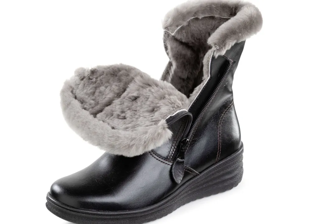 Stiefeletten von ELENA EDEN aus bestem Nappaleder mit flauschigem Lammfellbesatz: in Weite H, zwei seitliche Reißverschlüsse, Warmfutter aus echtem Lammfell, warme Wolldecksohle, leichte Synthetik-Profilsohle sowie 30 mm Keilabsatz. Schafthöhe ca. 19 cm