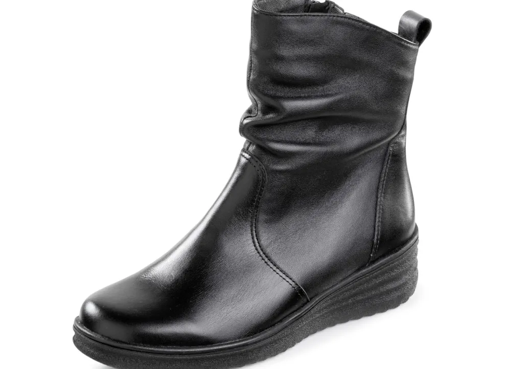 Stiefeletten von ELENA EDEN aus schwarzem Nappaleder, mit aparter Raffung: Weite H, Innenreißverschluss und Elastikeinsatz, echtes, molliges Lammfellfutter, warme Wolldecksohle, leichte Synthetik-Profilsohle sowie 30 mm Keilabsatz. Schafthöhe ca. 18 cm