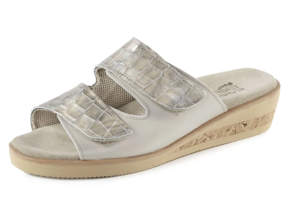 ELENA EDEN-Pantolette aus krokogeprägtem, teilweise schattiertem Lackleder, sowie Nappaleder: Weite H, zwei Klettspangen, Futter, gepolstertes Lederfußbett, leichte EVA-Riffelsohle, 25 mm Keilabsatz mit Korkeinlage