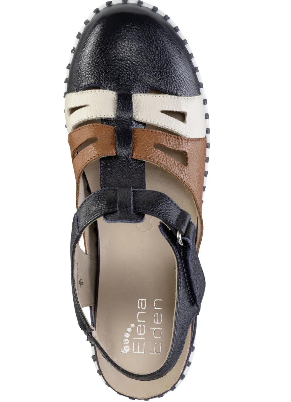 Luftig perforierte Sandale von ELENA EDEN in Marine-Bunt, aus genarbtem Nappaleder mit Klettspange: Weite H, verdeckter Fersengummizug, Futter, herausnehmbares Lederfußbett, leichte Synthetik-Profilsohle sowie 10 mm Keilabsatz
