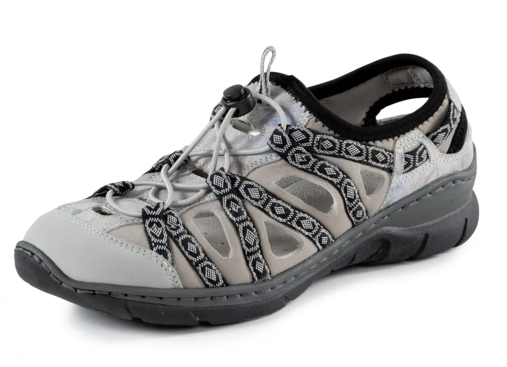 ELENA EDEN Sandale mit Textilbordüre in Grau-Taupe und in Größe 42.