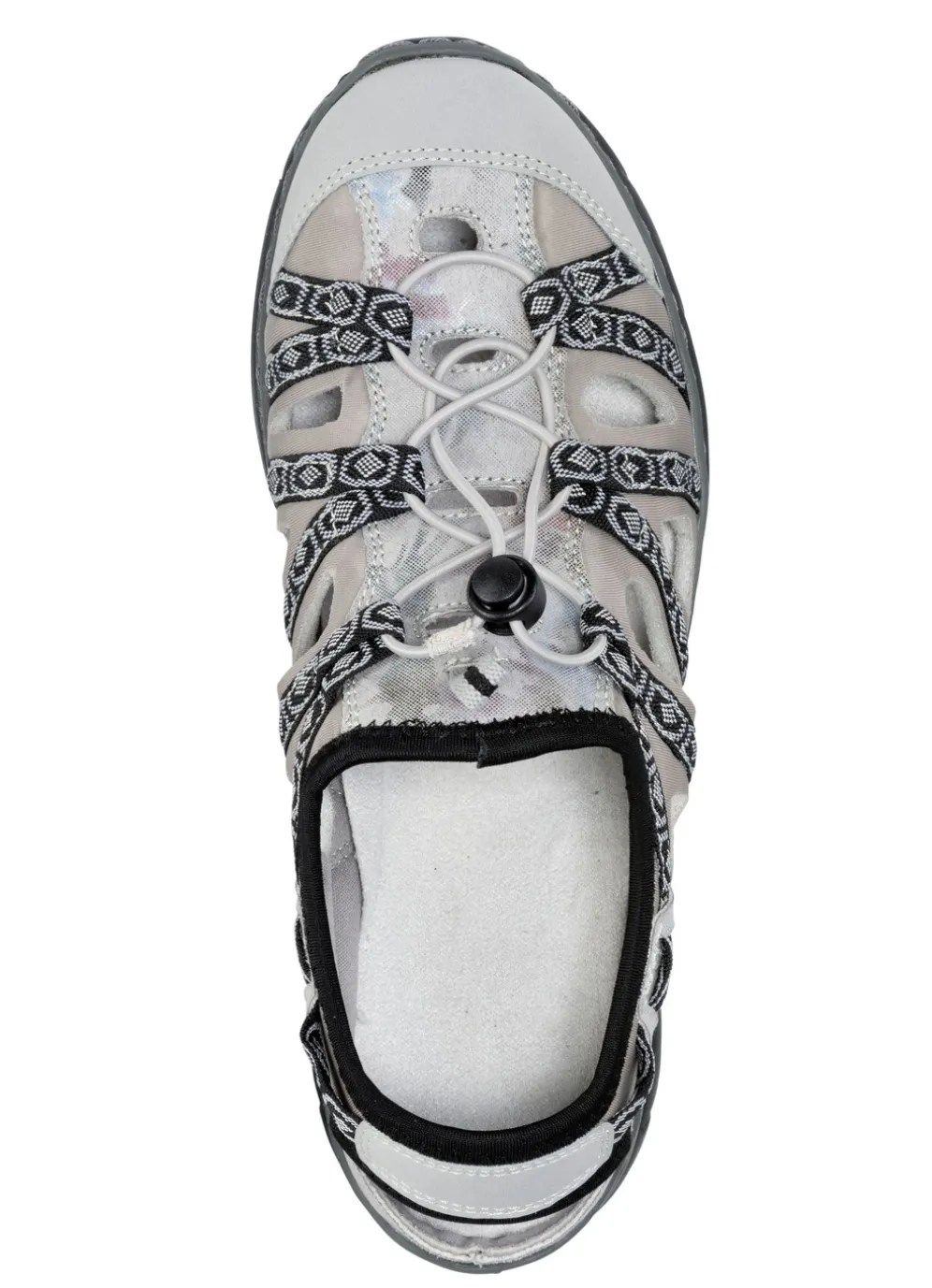 Sommerliche ELENA EDEN-Sandale aus teilweise floral bedrucktem Synthetik und elastischem Textil: Weite G, Textilbordüre, Schnellverschluss mit Elastikkordel und Stopper, Textilfutter, gepolsterte Decksohle, superleichte PU-Laufsohle sowie 15 mm Keilabsatz