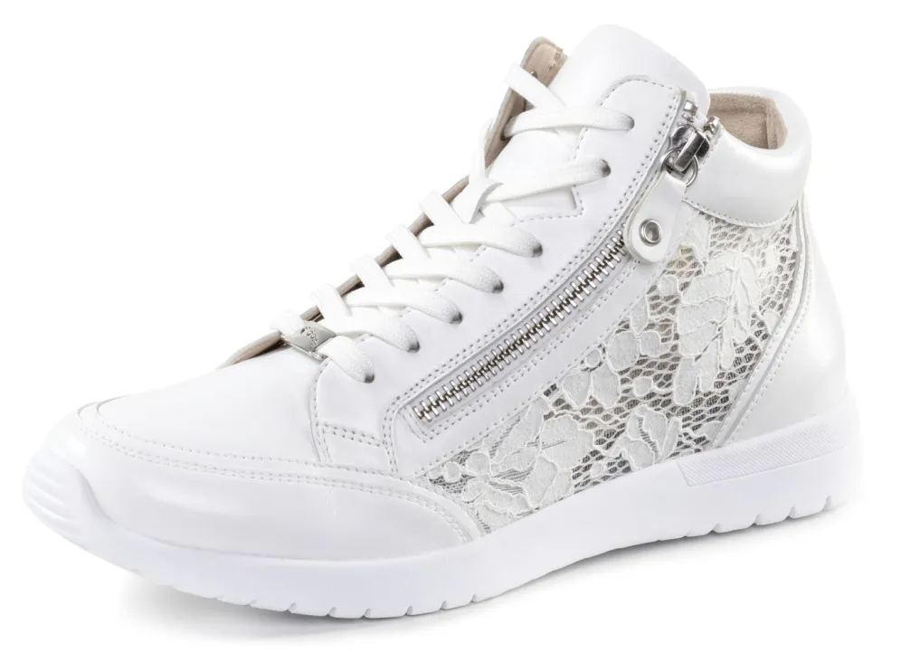 Weiße Boots von ELENA EDEN aus Nappaleder und luftigem Mesh-Material mit Blumenmuster in Spitzenoptik: Weite G, Schnürung, Seitenreißverschluss, teilweise gefüttert, herausnehmbares Lederfußbett, superleichte PU-Riffelsohle sowie 10 mm Keilabsatz. Schafthöhe ca. 9 cm
