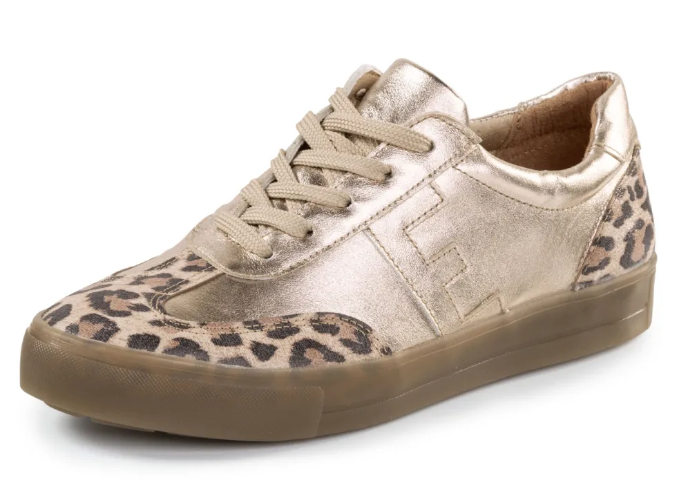 Trendiger Schnür-Sneaker von ELENA EDEN, aus genarbtem Nappaleder, in Altgold-Braun mit rassigen Leo-Besätzen: Weite H, Futter, herausnehmbares Lederfußbett, leichte TR-Profilsohle sowie 10 mm Keilabsatz