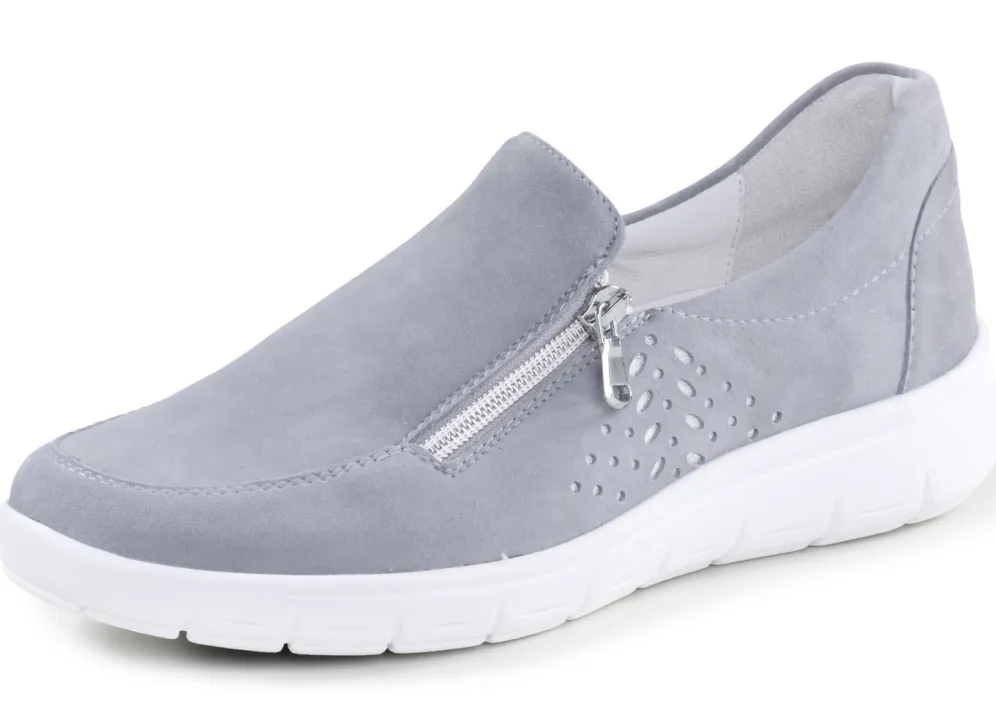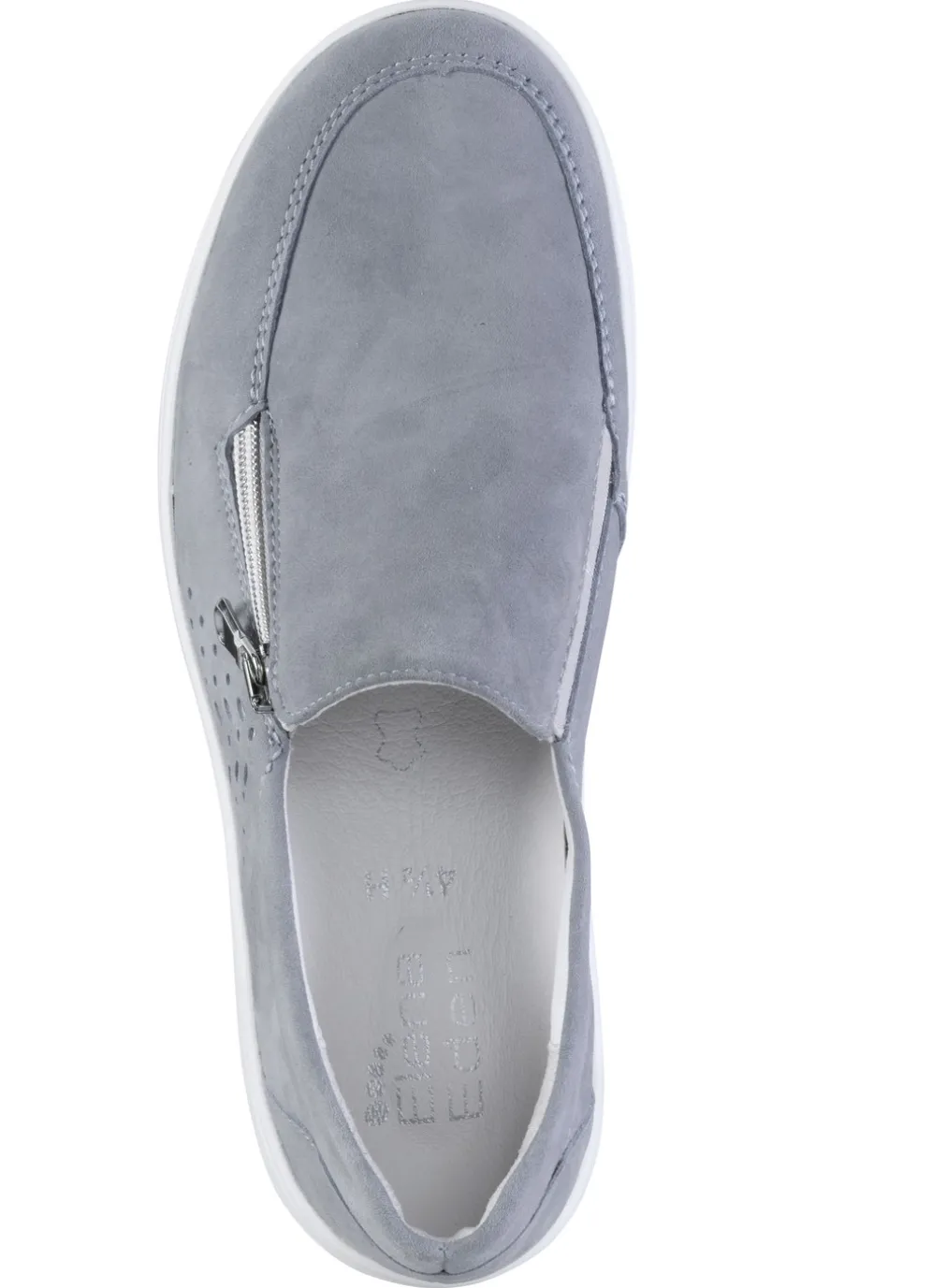 ELENA EDEN-Slipper aus hochwertigem Veloursleder mit Zier-Perforation und seitlichem Reißverschluss: Weite H, seitlich eingesetzter Gummizug, Lederfutter, herausnehmbares Lederfußbett, leichte PU-Luftpolster-Profilsohle sowie 20 mm Keilabsatz