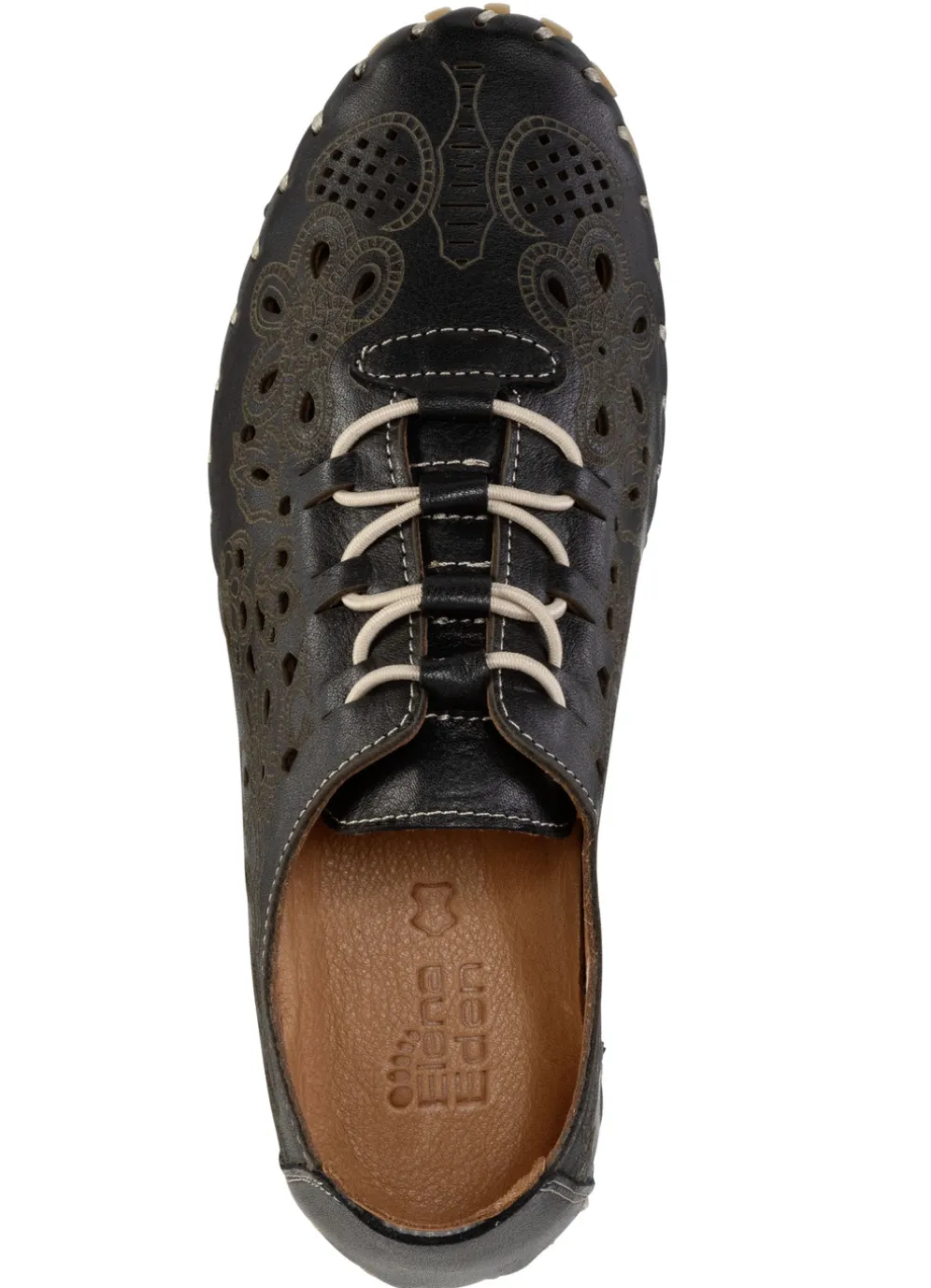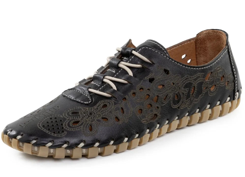 Luftig perforierter Slipper von ELENA EDEN, aus weichem Nappaleder mit Prägung: Elastik-Schnürung, Lederfutter, gepolsterte Lederdecksohle, superleichte TPU-Noppensohle sowie 10 mm Keilabsatz