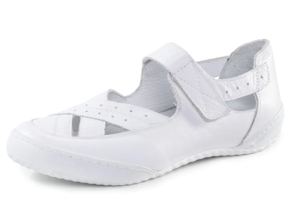Luftiger ELENA EDEN-Slipper aus weichem Nappaleder: verstellbare Klettspange, Lederfutter, herausnehmbares Lederfußbett, leichte Synthetik-Riffelsohle, 10 mm Keilabsatz