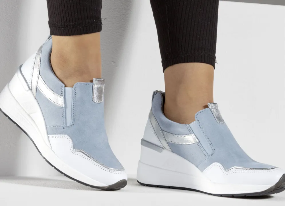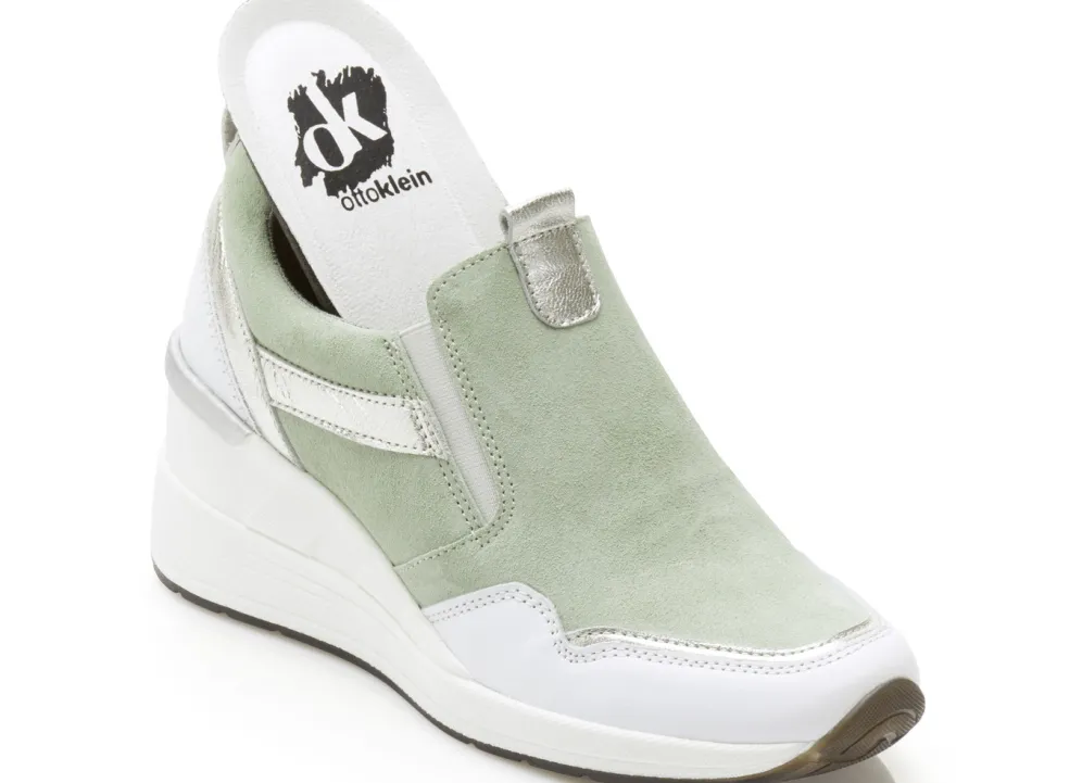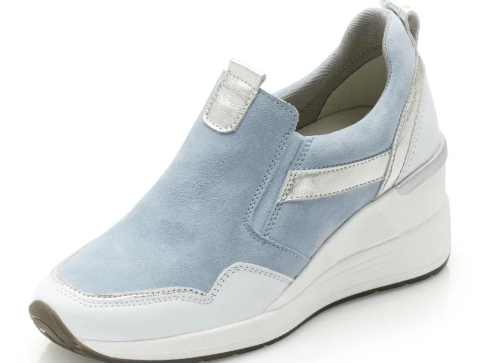 Slipper von ELENA EDEN, aus Rind-Veloursleder sowie Nappaleder in Weiß und Silber, mit seitlich eingesetzten Gummizügen: in Weite H, Textilfutter, herausnehmbares Fußbett, leichte TR-Laufsohle sowie 50 mm Keilabsatz