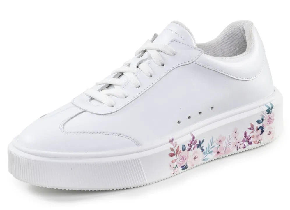 Weißer ELENA EDEN-Sneaker aus Nappaleder, teilweise mit Zier-Perforation: Weite G, Schnürung, gepolstertes Textilfutter, herausnehmbares Fußbett, leichte TR-Laufsohle mit 25 mm Plateau und Blumen-Dessin