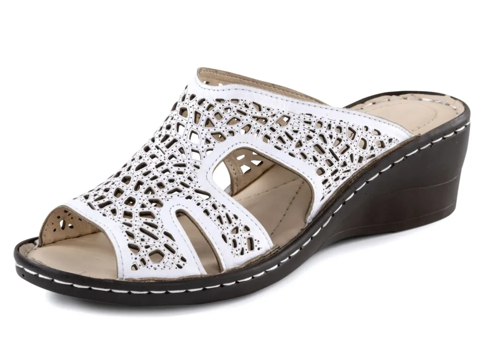 Pantoletten von ELENA EDEN aus perforiertem, geprägtem Nappaleder: Lederfutter, gepolsterte Lederdecksohle, leichte Synthetik-Laufsohle sowie 40 mm Keilabsatz