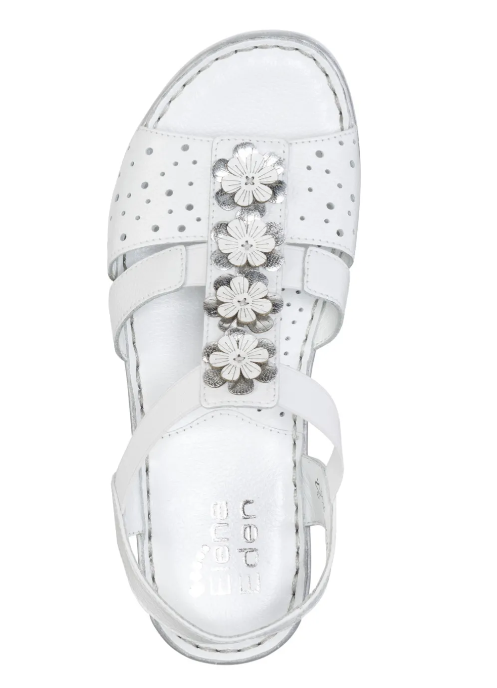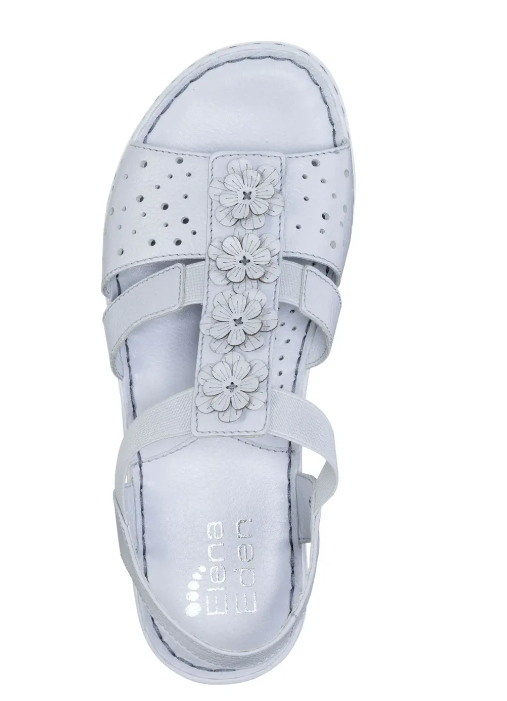 Sandalen von ELENA EDEN aus genarbtem Nappaleder mit luftiger Lochung und niedlichen Lederblüten: Weite G, seitliche Elastik-Bandagen, Lederfutter, weich gepolsterte Lederdecksohle, leichte PU-Riffelsohle sowie 15 mm Keilabsatz