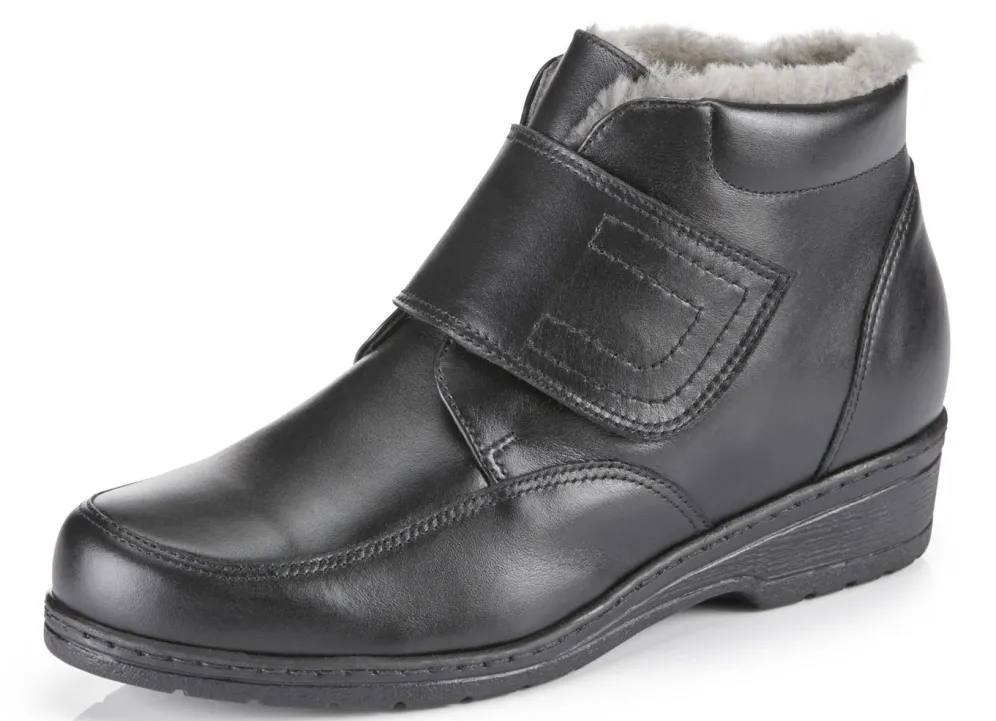 ELENA EDEN-Stiefelette aus Rind-Anilinleder, mit praktischer Klettspange: Weite H, echtes, molliges Lammfellfutter, warme Decksohle, leichte TR-Profilsohle, 30 mm Keilabsatz. Schafthöhe ca. 10 cm