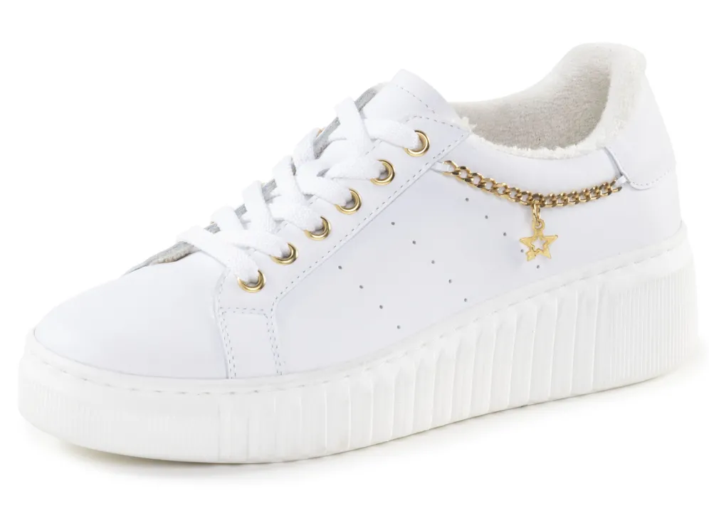 Sneaker von ELENA EDEN, aus Nappaleder, mit trendigem Ketten-Schmuck und Zier-Perforation: Weite G, Schnürung, gepolstertes Frottee-Futter, herausnehmbares Fußbett, leichte 30 mm TR-Plateausohle mit 45 mm Keilabsatz