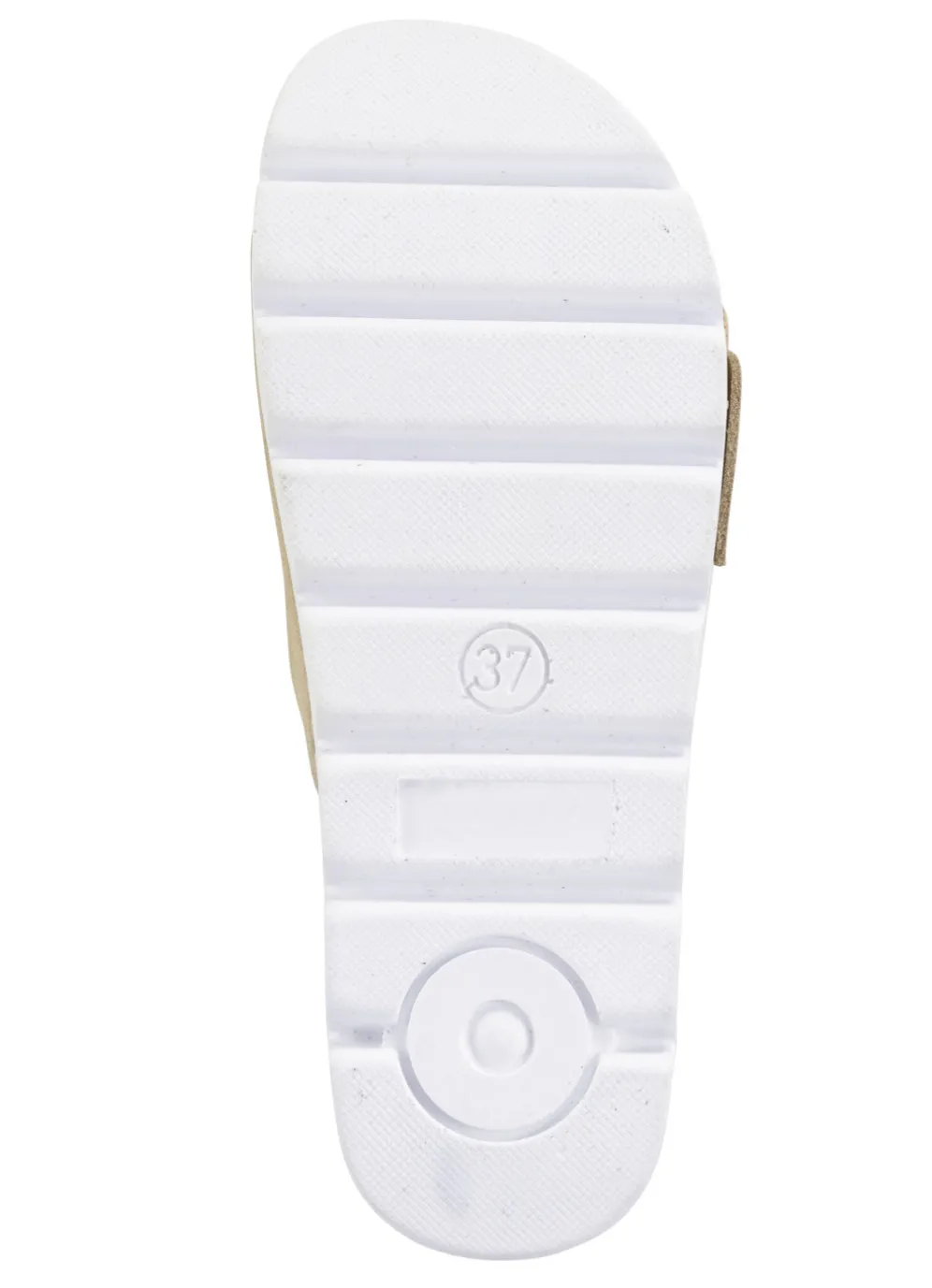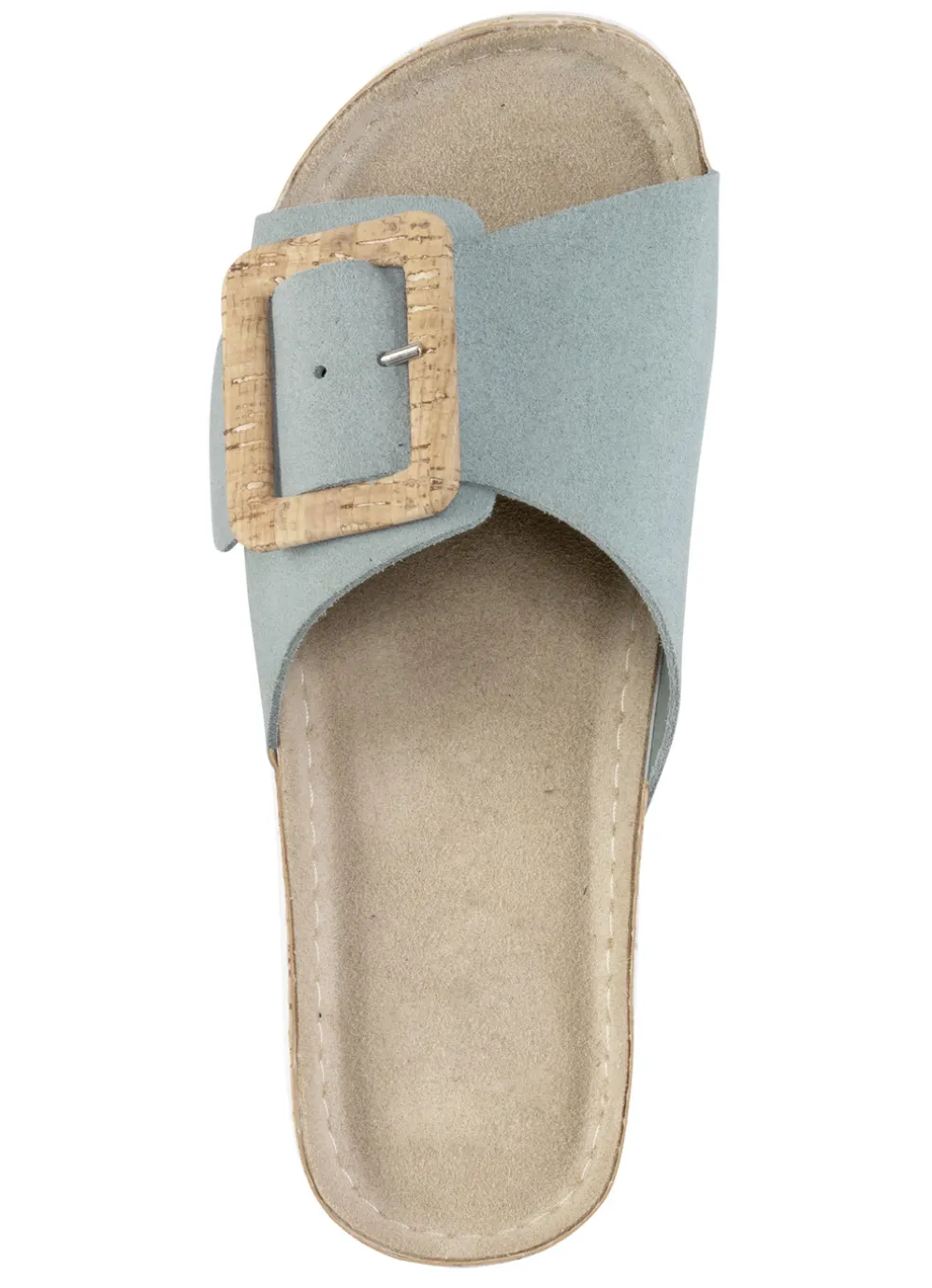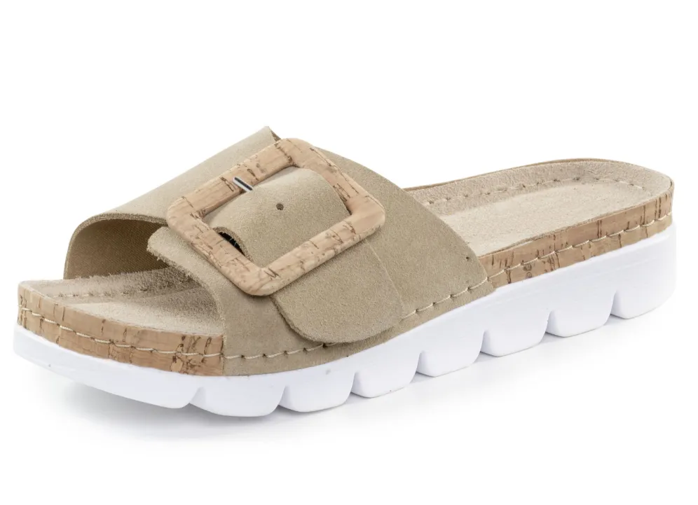 Pantoletten von ELENA EDEN aus weichem Veloursleder mit verstellbarer Kork-Schließe: gepolstertes Lederfußbett mit korkbezogenem Rahmen, leichte PU-Profilsohle, 10 mm Keilabsatz