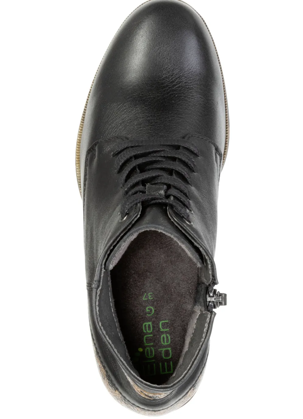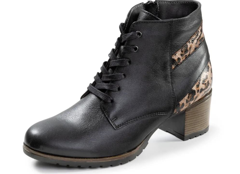Stiefeletten von ELENA EDEN in Schwarz-Braun aus fein genarbtem Nappaleder, teilweise mit schimmerndem Leo-Druck: Weite G, Schnürung, Innenreißverschluss, Futter, herausnehmbares Fußbett, leichte TR-Profilsohle sowie 40 mm Absatz. Schafthöhe ca. 11 cm
