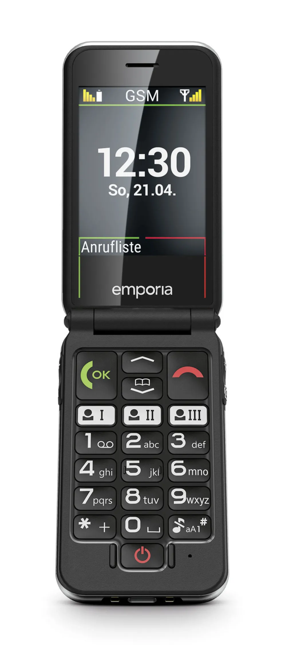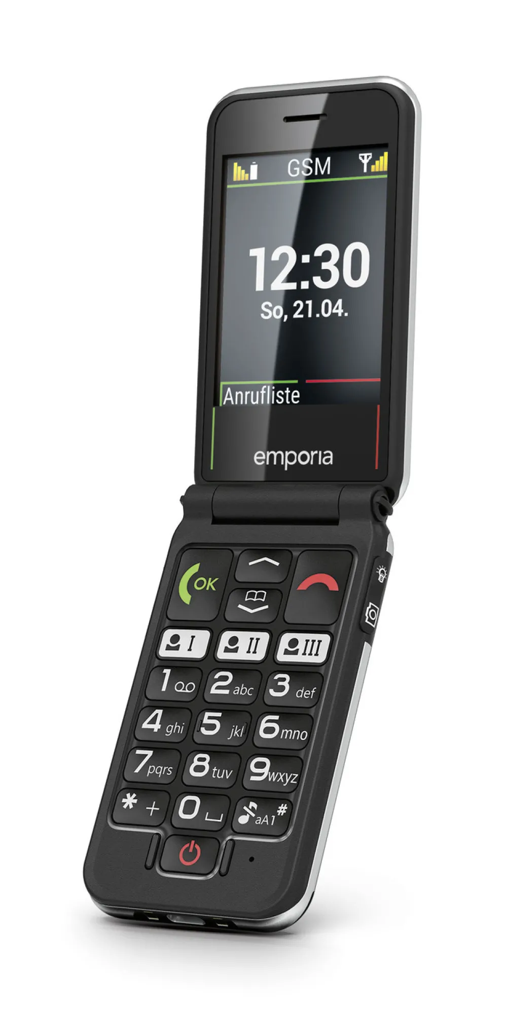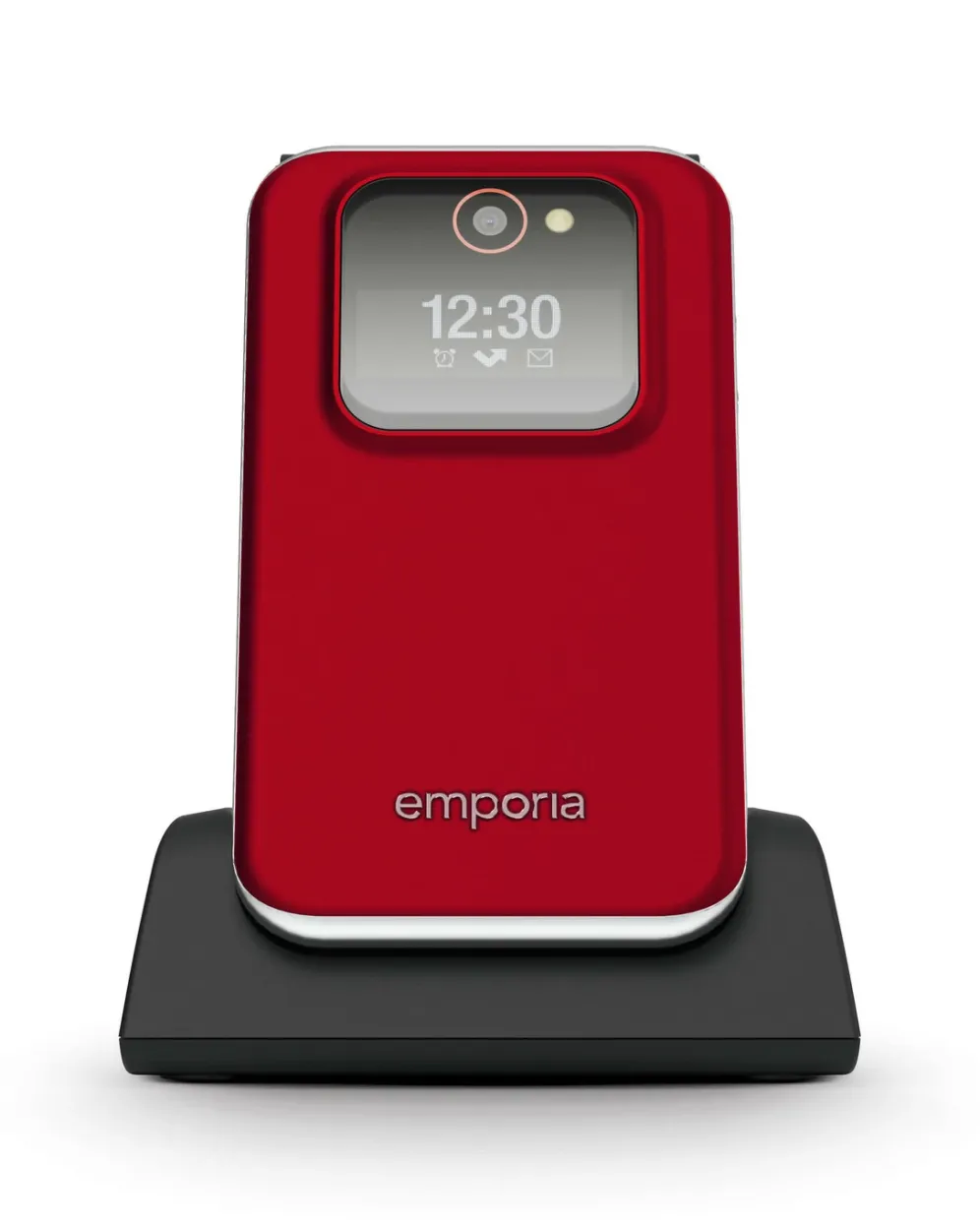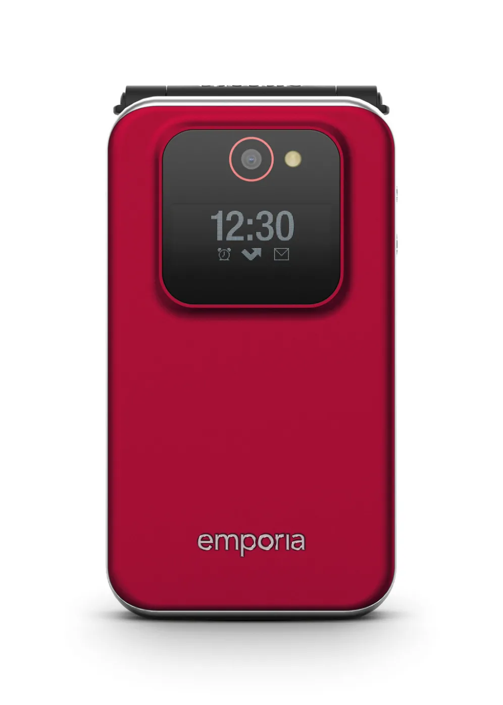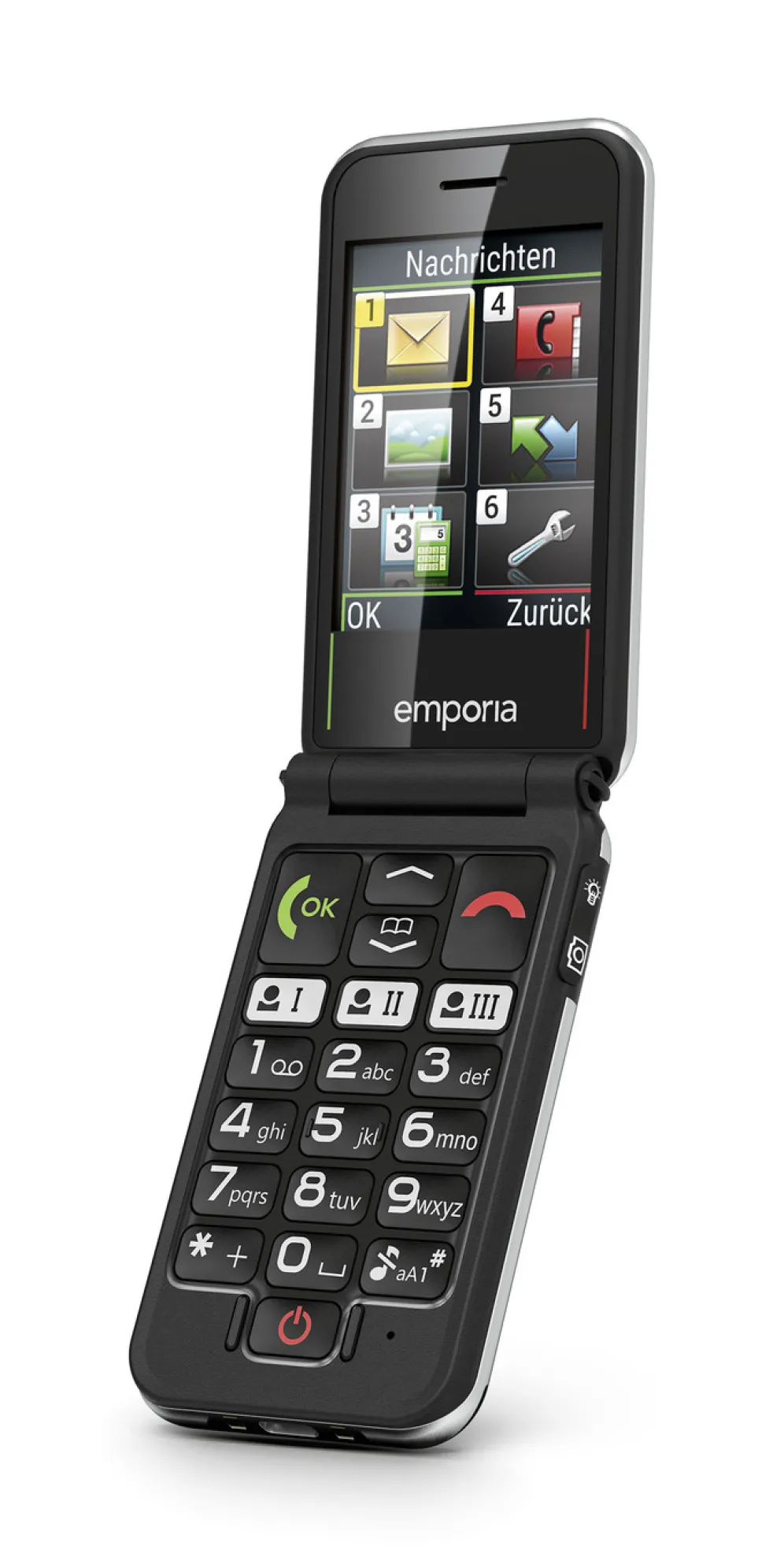 Emporia JOY. Klapphandy mit 2,8″ (7,1 cm) Innendisplay und 1,1″ (2,8 cm) Außendisplay. Mit 3 Kurzwahltasten. Hauptkamera mit 2 Megapixel. Mit Notruffunktion, bis zu 5 Notrufnummern werden automatisch hintereinander durch einen Tastendruck angerufen. Nach Bestätigung des Notrufs wird eine Notruf-SMS an Notrufnummern versendet. Hörgerätetauglich. IP54 staub- und spritzwassergeschützt.