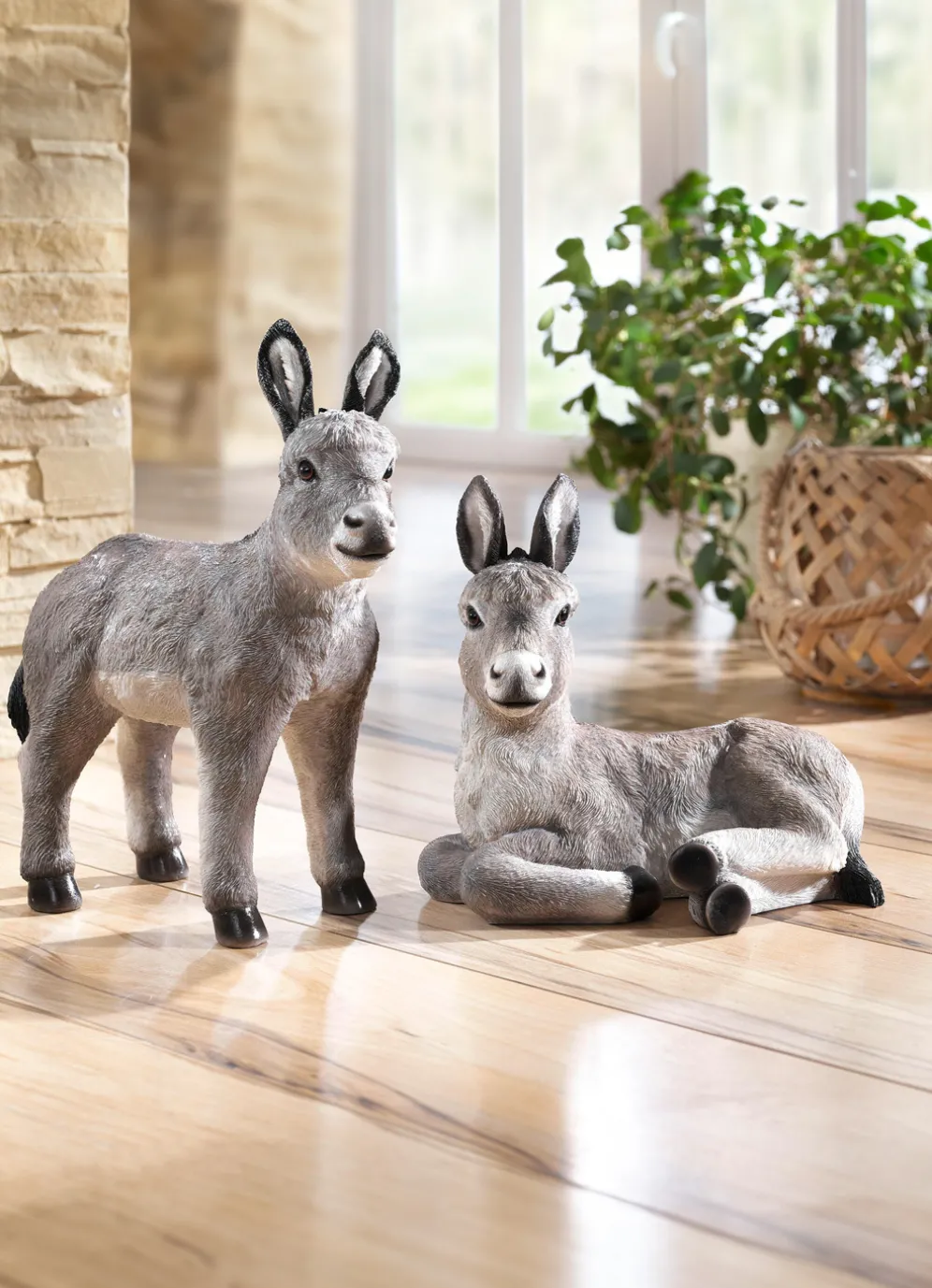 Fast wie echt wirken diese beiden Esel, die zum natürlichen Blickfang in Ihrem Zuhause avancieren. Sehr detailliert aus Polyresin gestaltet und sorgfältig von Hand bemalt.