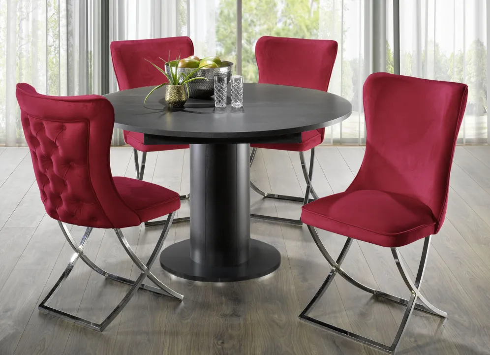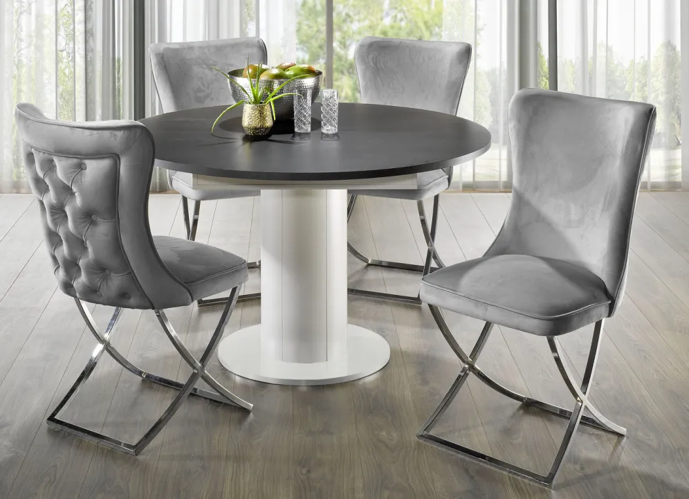 Schaffen Sie sich einen ganz individuellen Essplatz mit diesen außergewöhnlichen Esszimmermöbeln! Der runde Tisch ist durch eine Klappeinlage im Handumdrehen um 40 cm erweiterbar. Die Tischplatte ist jeweils farblich vom Gestell abgesetzt. Mit Aufbau-Anleitung. Maße: ø 130 cm, Höhe 78 cm. Ausgezogen L170xB130 cm.