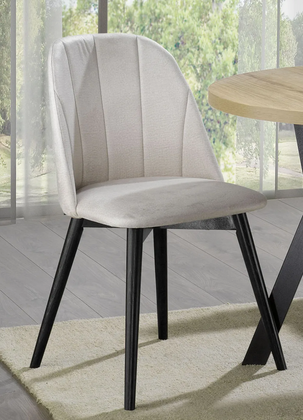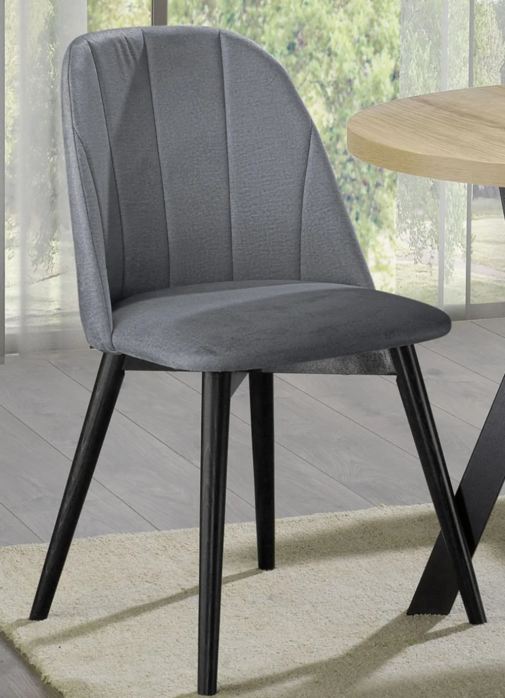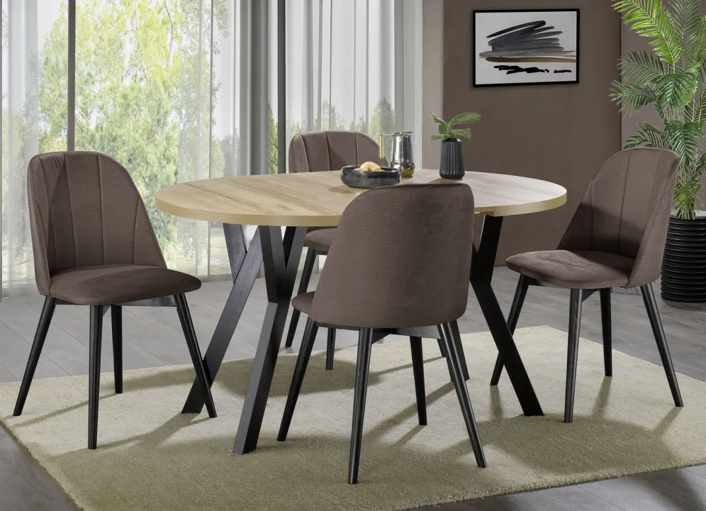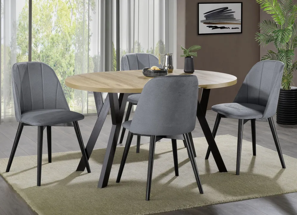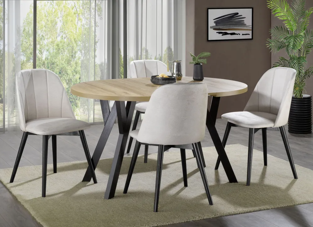 Freuen Sie sich auf neue teilmassive Esszimmermöbel im schicken Design! Gepolsterte Stühle mit Samtbezug aus Mikro-Velour (100% Polyester). Einfach zu reinigen. Mit massiven schwarzen Buchenholzfüßen.