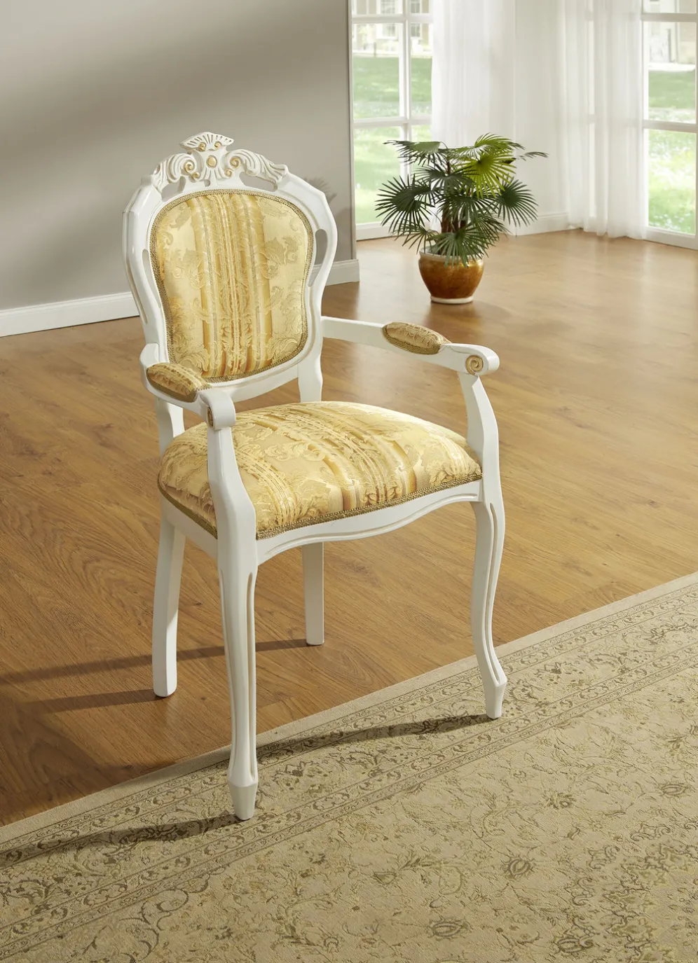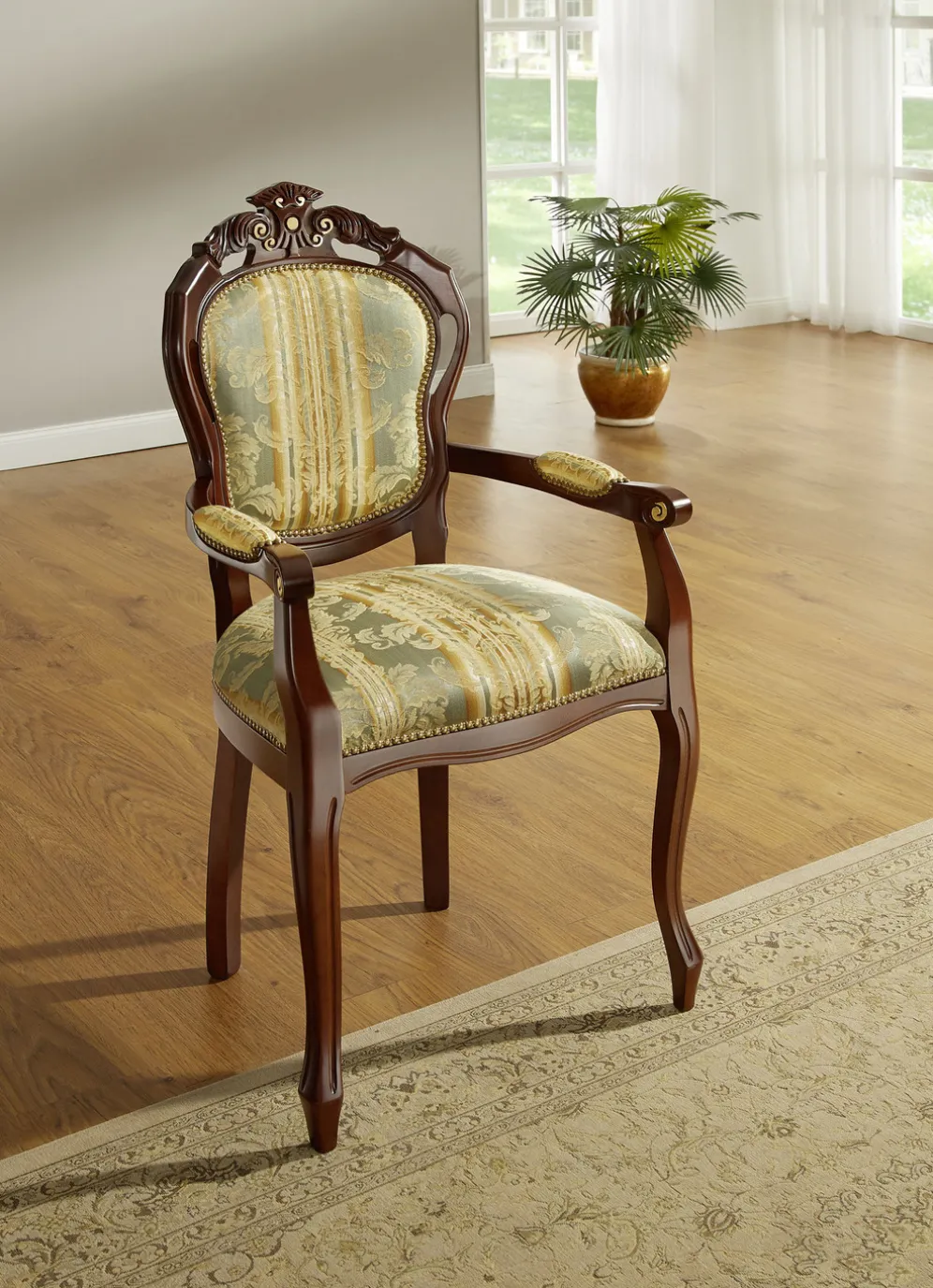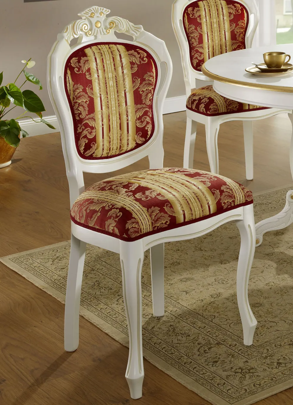 Herrliche Esszimmerstühle mit ganz besonderem Charme und zahlreichen Verzierungen! Der Armlehnensessel und die Stühle sind mit komfortabler Federkernpolsterung ausgestattet. Bezug aus 60% Baumwolle und 40% Polyester. Das Gestell der Armlehnensessel und Stühle ist aus massivem Buchenholz. Die Lieferung erfolgt aufgebaut.