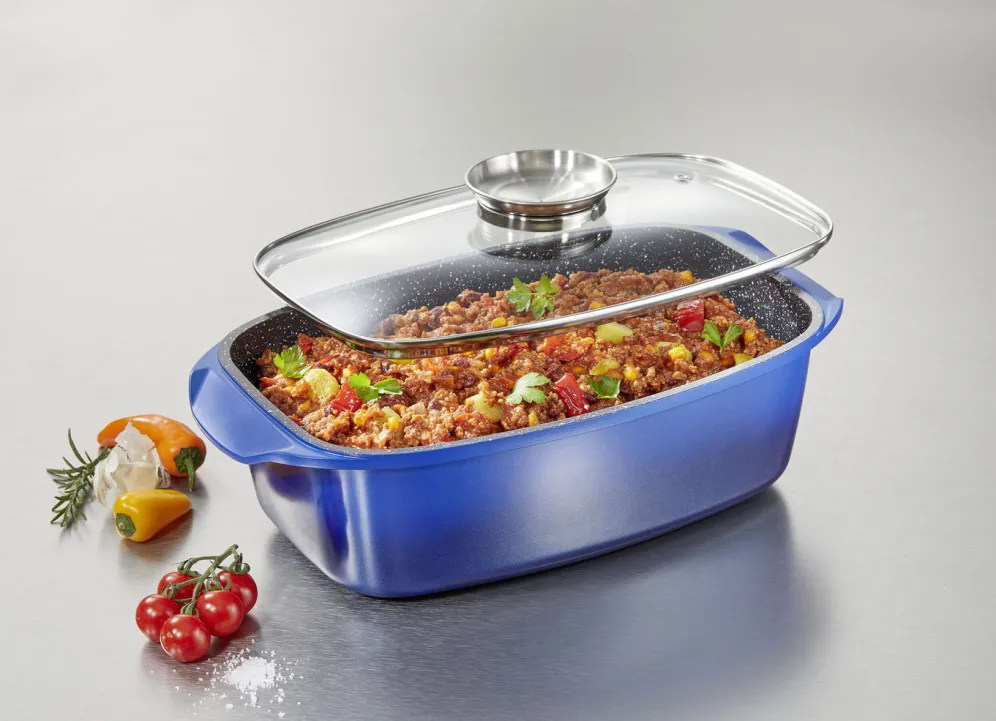 Extra hoher Aluguss-Bräter von King mit Antihaft-Beschichtung in Blau.