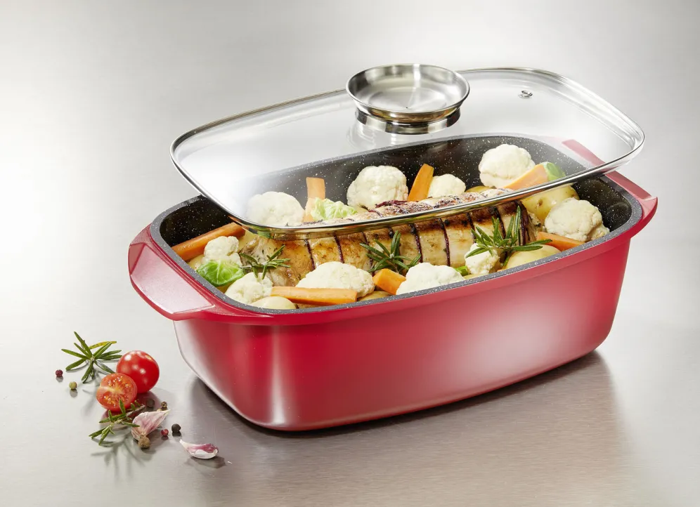 King Bräter aus Aluguss mit Antihaft-Beschichtung. Sehr kratzbeständig. Für die fettarme und fettfreie Zubereitung von Speisen. Optimale Hitzeverteilung. Glasdeckel mit Aromaknopf. Backofengeeignet bis 240 °C, mit Deckel bis 180 °C. Für alle Herdarten geeignet, auch Induktion. Spülmaschinengeeignet