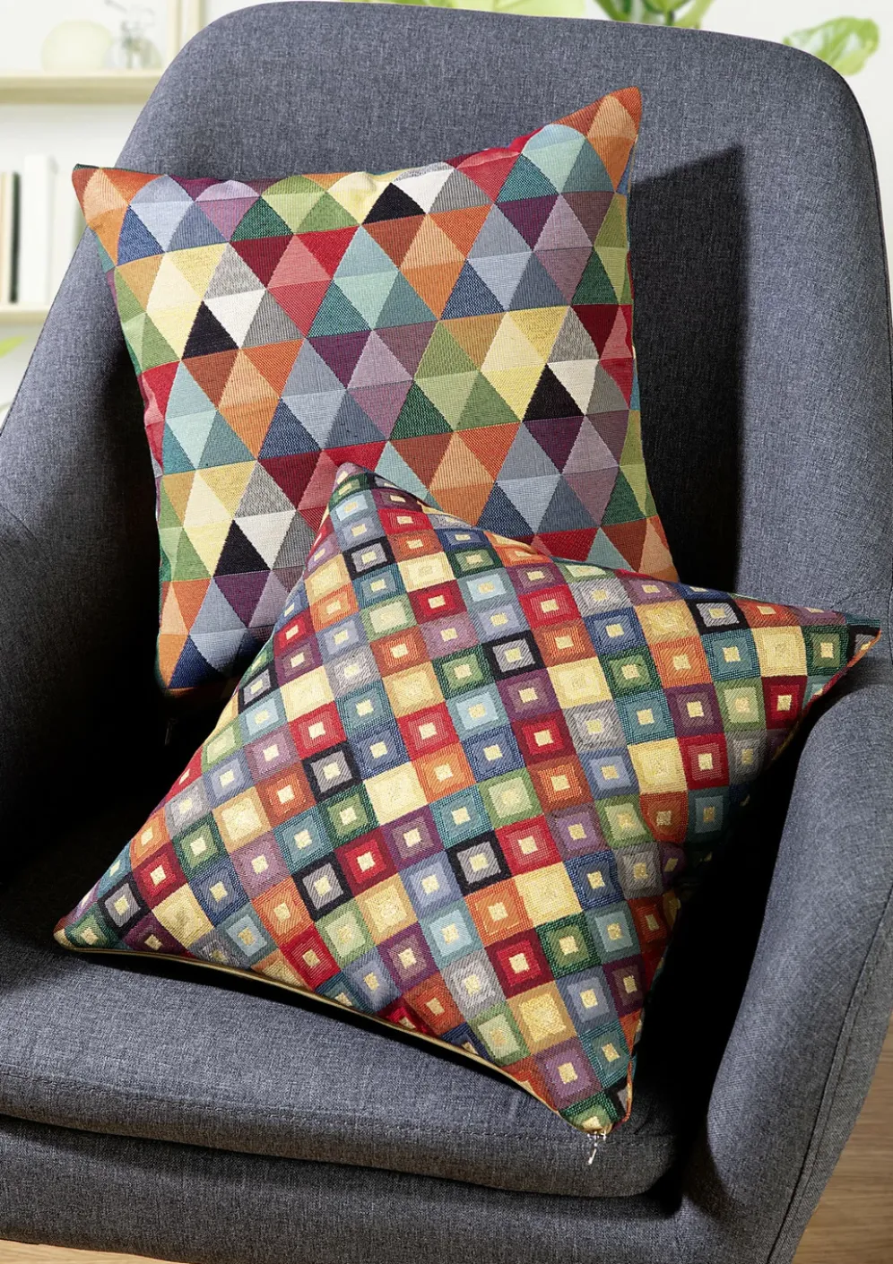 Farbenfrohe Kissenbezüge mit Reißverschluss in der Ausführung Dessin 2, in Größe 105 (40×40 cm) sowie in Bunt.