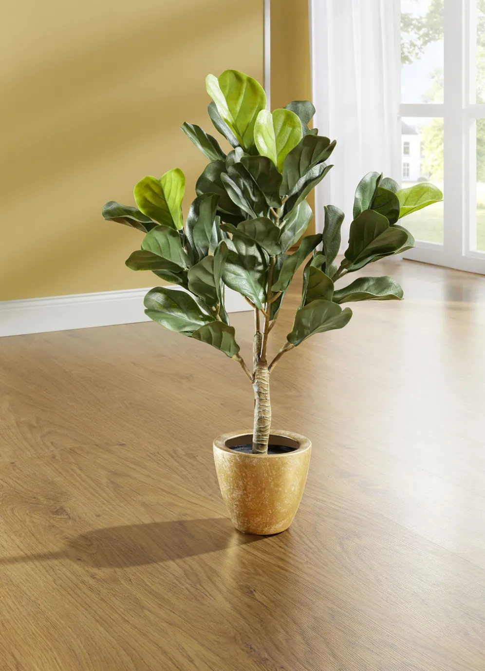 Diese dekorative und täuschend echt wirkende Feigenblattpflanze wird garantiert zum echten Blickfang in Ihren Wohnräumen. Sie bleibt das ganze Jahr über schön grün und benötigt fast keine Pflege. Fest in einen schwarzen Kunststofftopf eingesetzt. Aus hochwertigem Kunst- und Textilmaterial gefertigt. Maße: Höhe ca. 64 cm, Topf: Ø 11 cm, Höhe 10,5 cm