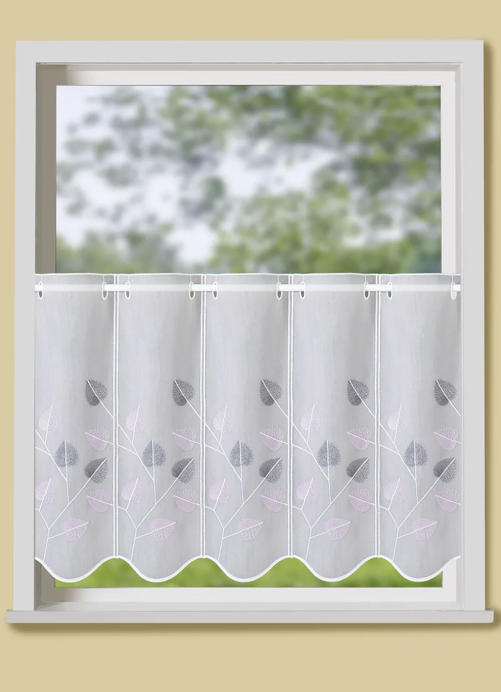 Dieser fein bestickte Kleinfenster-Store mit elegantem Blättermotiv setzt einen stilvollen Akzent in jedem Raum. Mit Stangendurchzug und gebogten Abschluss. Die Qualität: Leichtbatist aus 100% Polyester