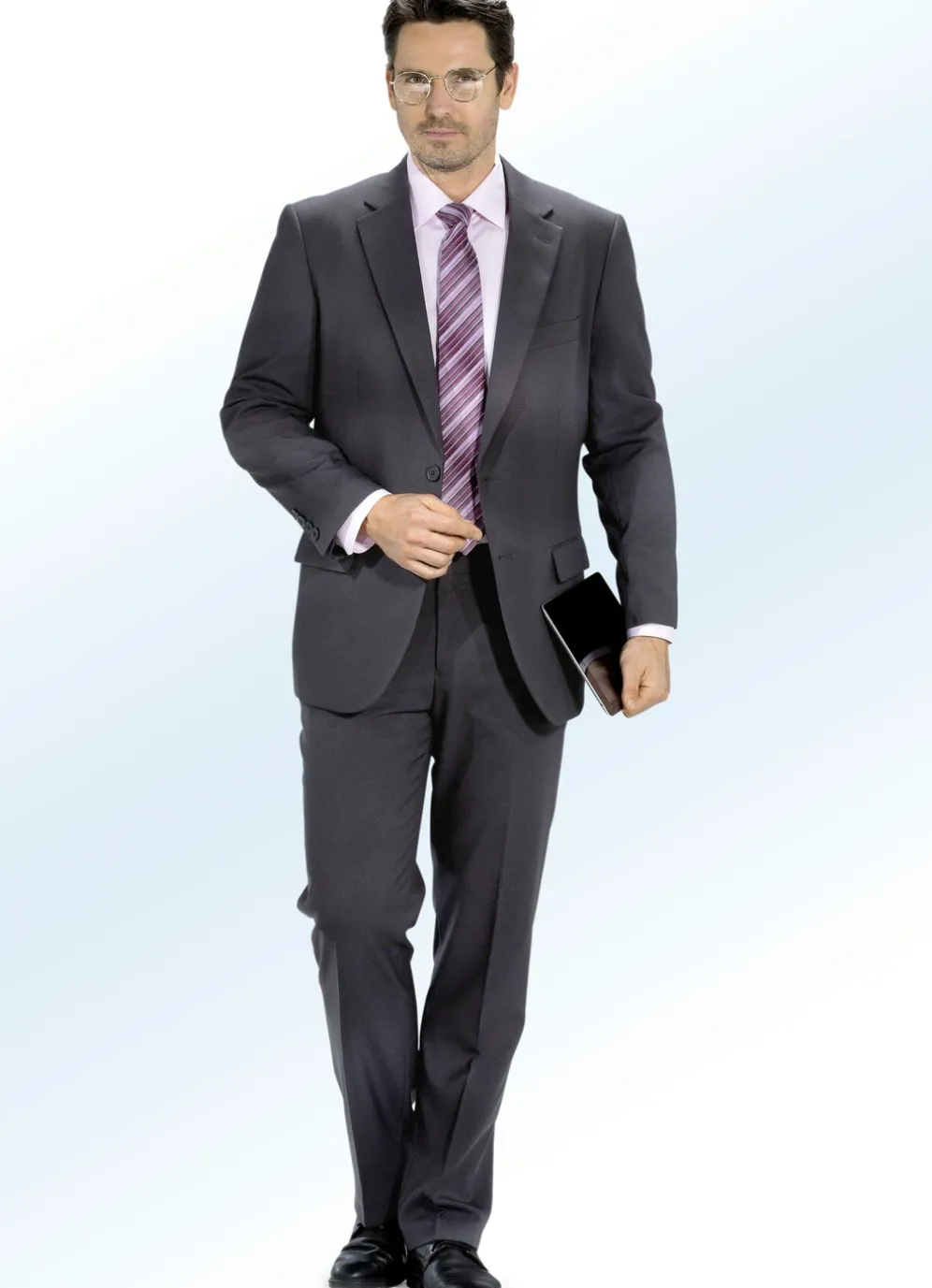 Schicker, fein gestreifter Anzug in Anthrazit! Einreihiger Sakko mit zwei Knöpfen, Pattentaschen, vier Innentaschen sowie Rückenschlitz. Hose mit Dehnbund, Seitentaschen sowie zwei Gesäßpaspeltaschen mit Knopf.