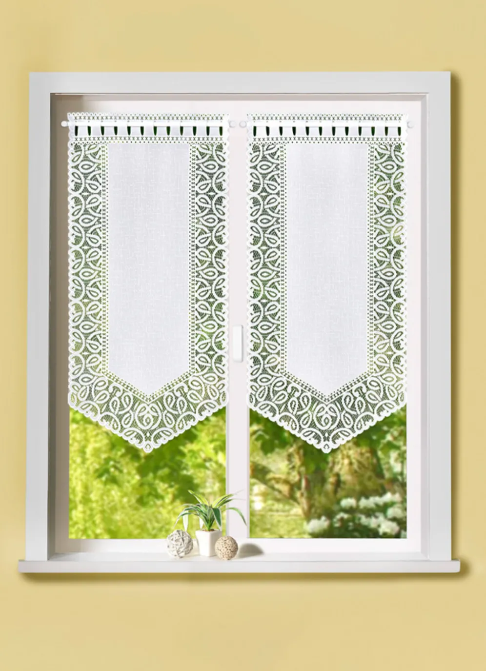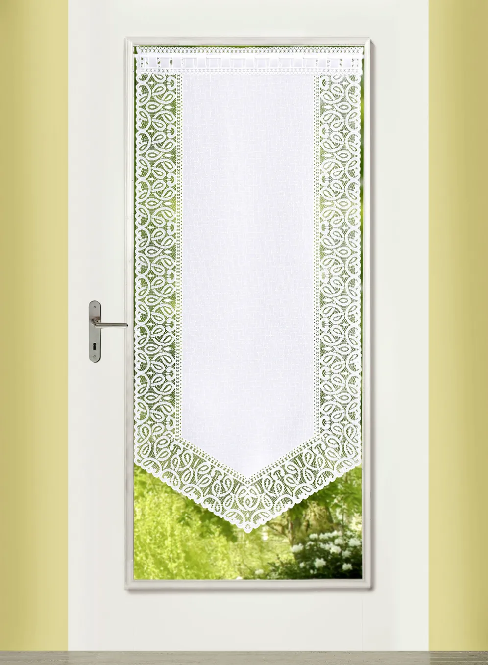 Fenster- und Türbehang mit Dreiecksabschluss in Größe 309 (2x Fensterbehang, H 80xB40 cm) und in Weiss.