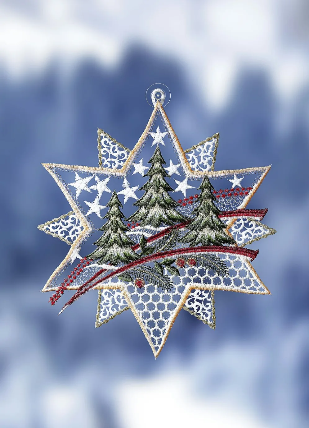 Es zeigt drei Tannen in einem weihnachtlichen Stern. Qualität: 100% Polyester. Mit praktischem Saughaken zur einfachen Befestigung. Maße: H26xB22 cm