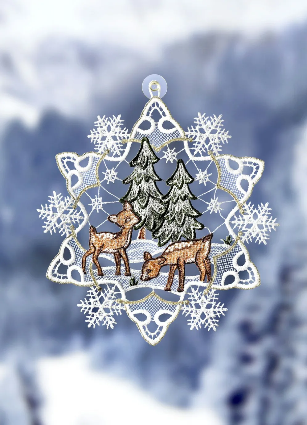 Mit diesem reizenden Fensterbild aus echter Plauener Spitze können Sie jeden Tag die beiden süßen Rehkitze im Wald betrachten. Mit praktischem Saughaken zur einfachen Befestigung.