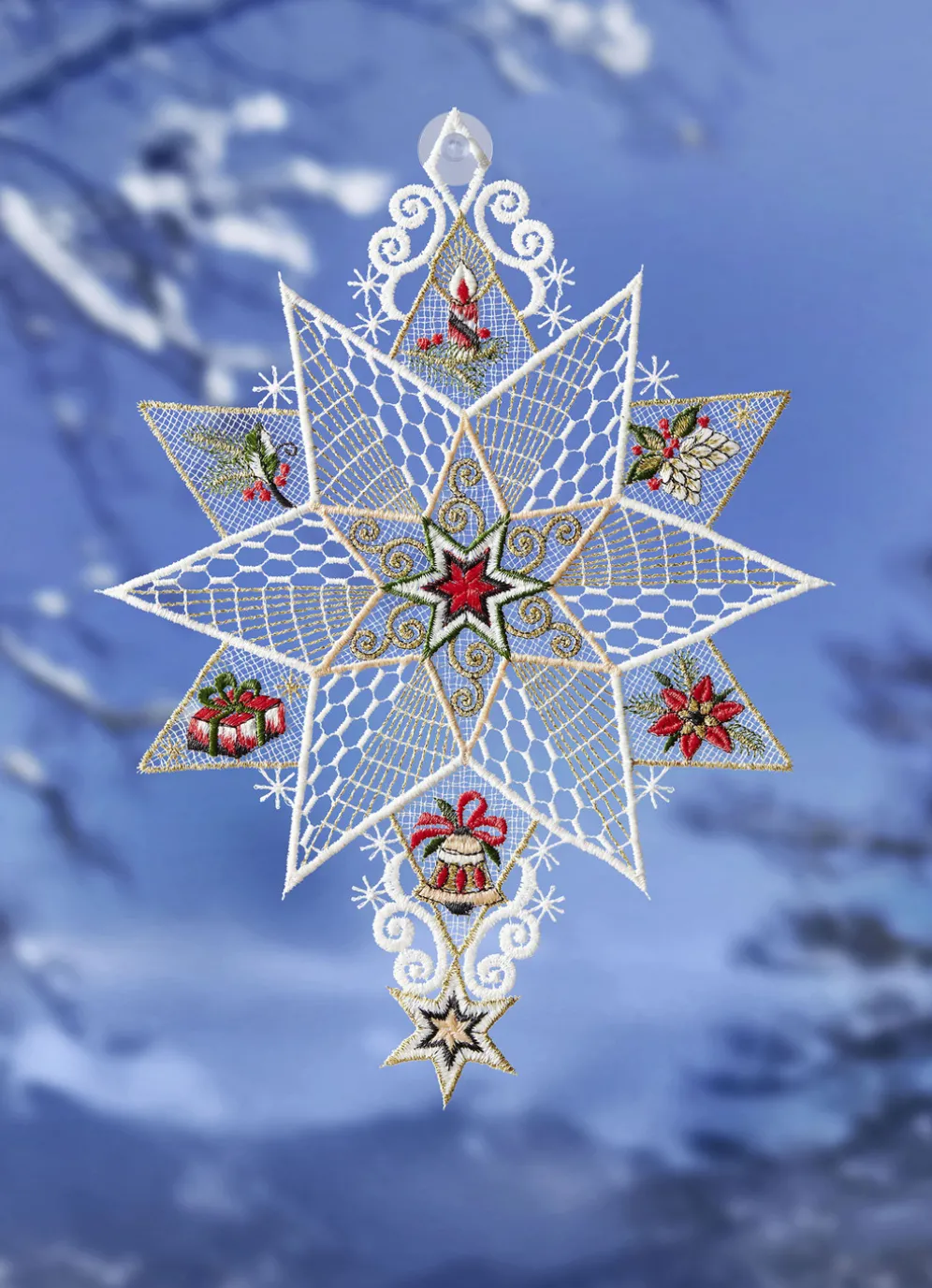 Ein festlicher Hingucker für die Adventszeit ist dieses detailreich gearbeitete Fensterbild „Stern” aus echter Plauener Spitze. Mit Saughaken zur einfachen Befestigung. Die Qualität: 100% Polyester. Maße: H29xB22 cm
