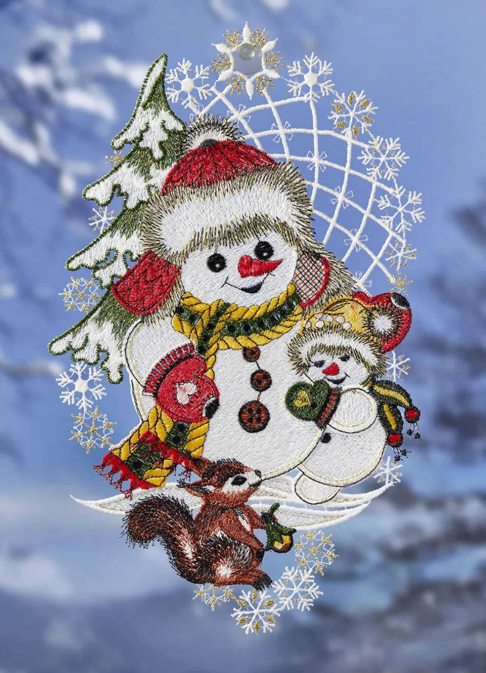 Dieses süße Fensterbild aus echter Plauener Spitze wird einen schönen, festlichen Akzent an Ihrem Fenster setzen. Es zeigt eine Schneemann-Familie mit einem Eichhörnchen. Mit Saughaken zur einfachen Befestigung. Die Qualität: 100% Polyester. Maße: 31×19 cm