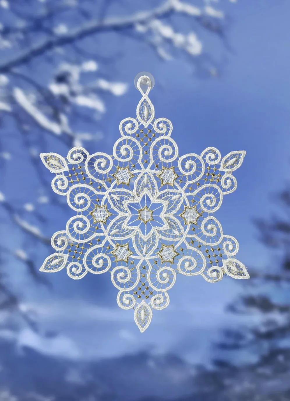 Ein entzückender, weiß-goldener Stern an Ihrem Fenster möchte Sie zur Weihnachtszeit begeistern! Aus echter Plauener Spitze hergestellt sowie mit Saughaken zur einfachen Befestigung. Die Qualität: 100% Polyester. Maße: 26×26 cm