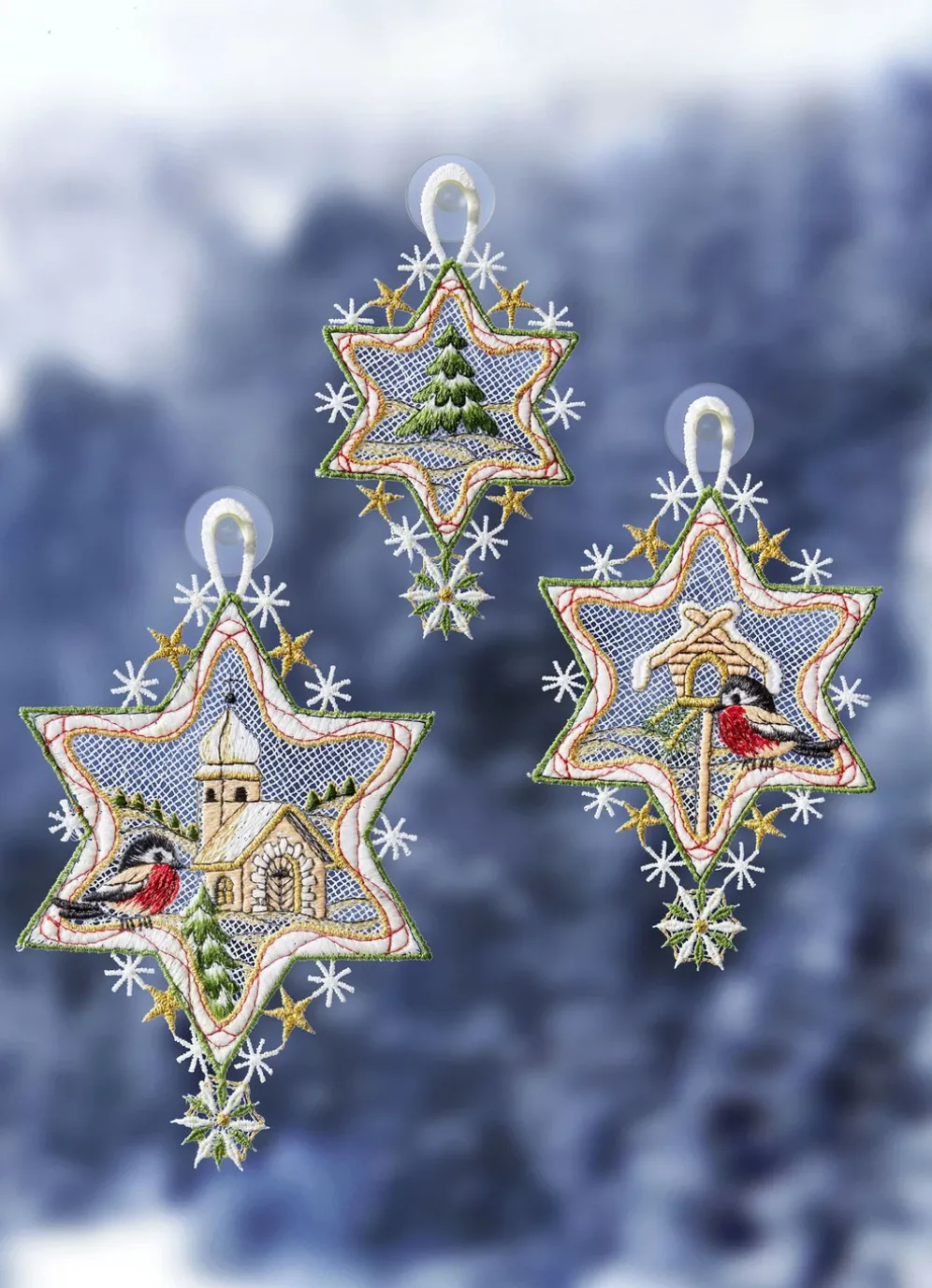 Fensterbild Sterne, 3er-Set, aus Plauener Spitze