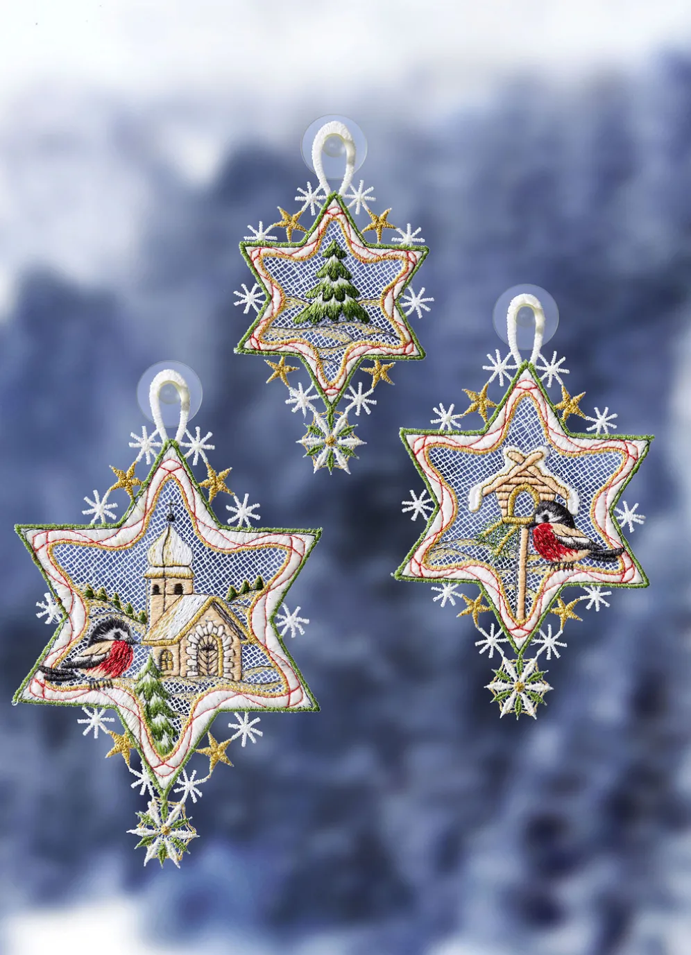 Maße: Stern mit Kirche H18xB11 cm; Stern mit Vogelhaus H15,5xB9,5 cm; Stern mit Bäumchen H12,5xB7 cm.