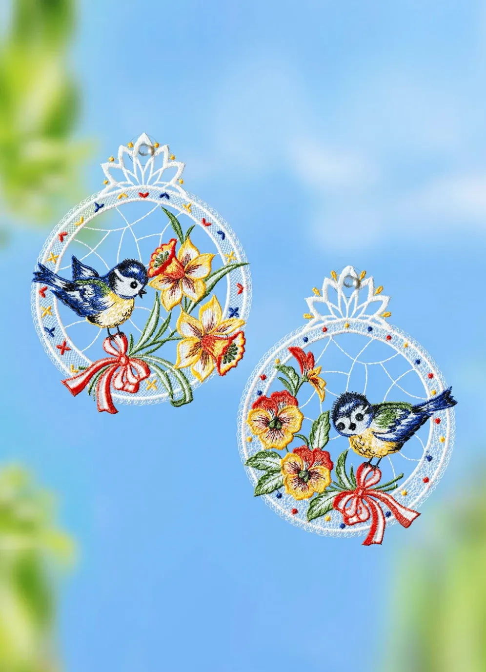 Fensterbilder aus Plauener Spitze im 2er-Set in Bunt.