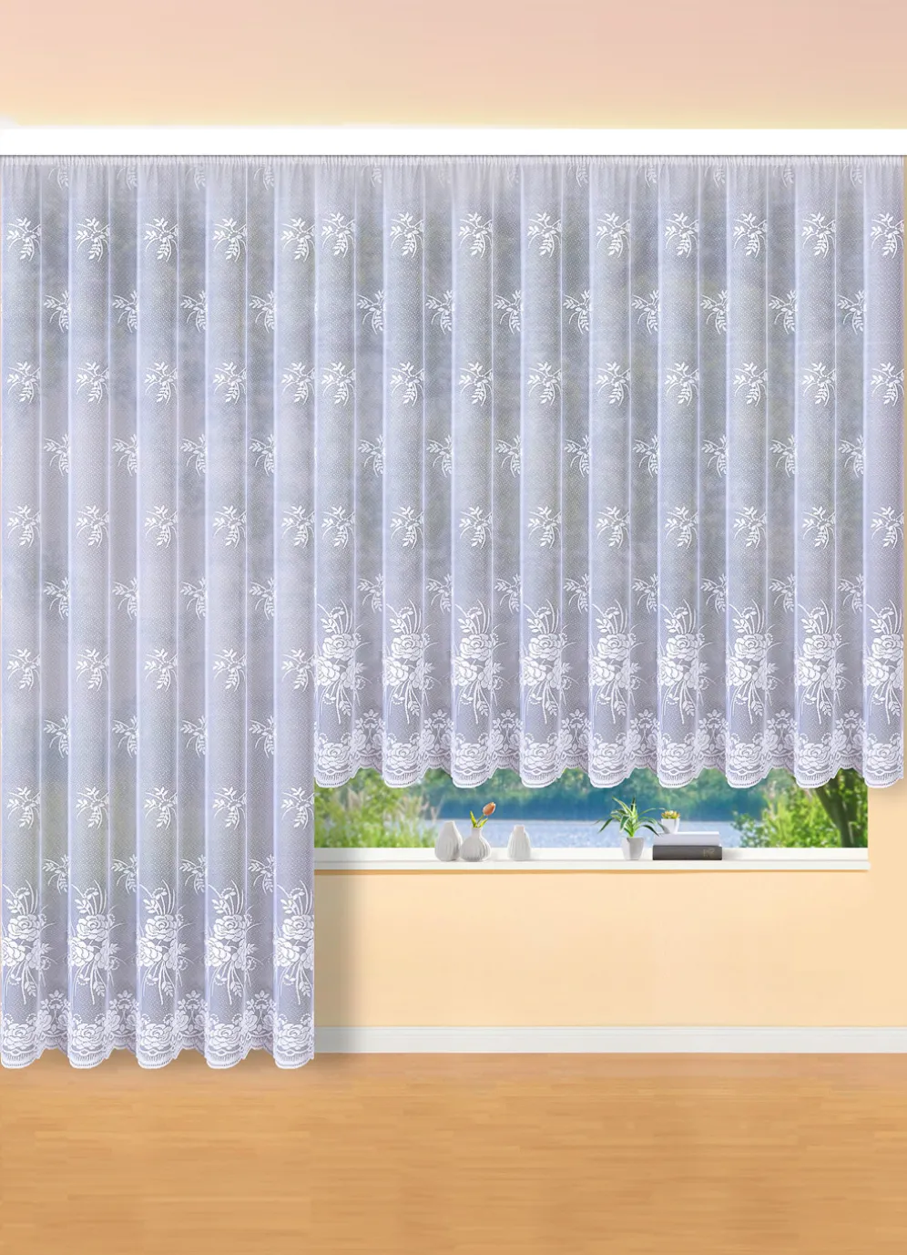 Ein Blickfang ist dieser aparte, floral dessinierte Store mit Universalschienenband, schönen Verzierungen und gebogtem Abschluss. Qualität: Jacquard aus 100% Polyester