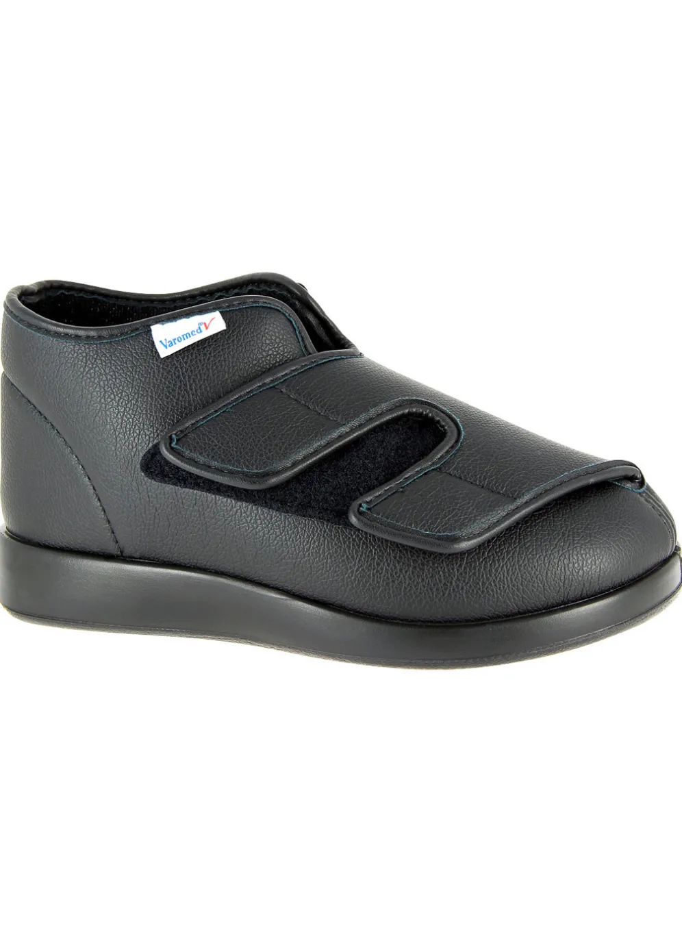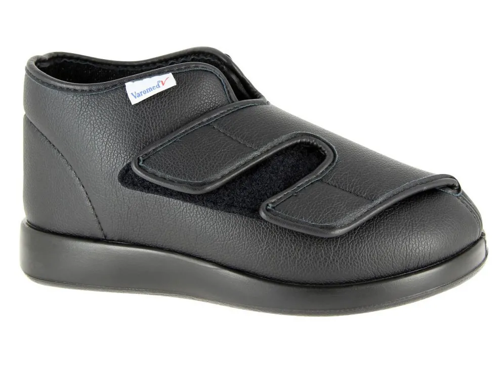 Hochwertiger schwarzer Verband- und Therapieschuh aus abwaschbarem PU-beschichtetem Microvelours. Besonders geeignet für empfindliche Problemfüße, mit weit zu öffnendem Klettverschluss. Besonders leicht.