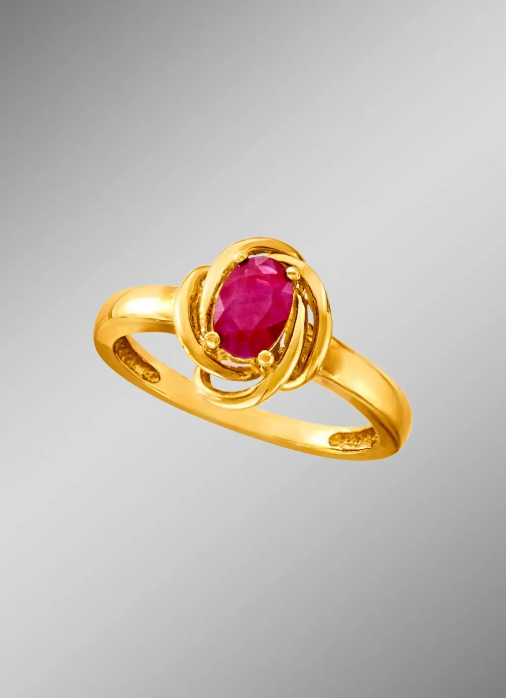 Klassischer Edelstein-Charme, der Stil und Eleganz verleiht. Der 6×4 mm große Rubin präsentiert sich im Zentrum des 10 mm runden Ringkopfs. Das temperamentvolle Rot verbindet sich mit dem warmen Glanz von edlem Gold 585/- fein oder 375/- fein.