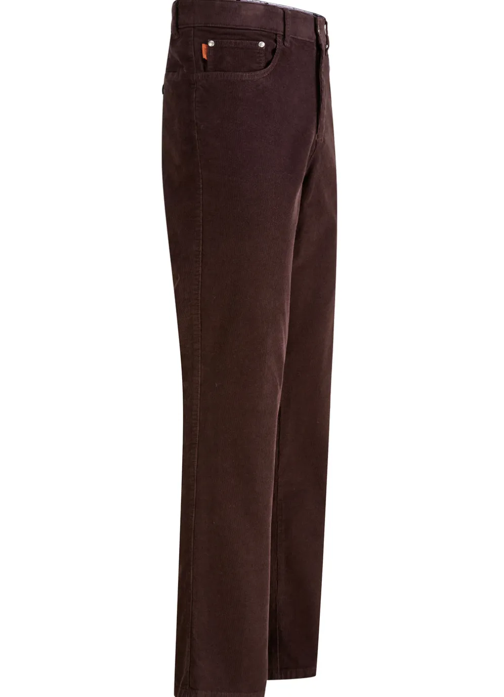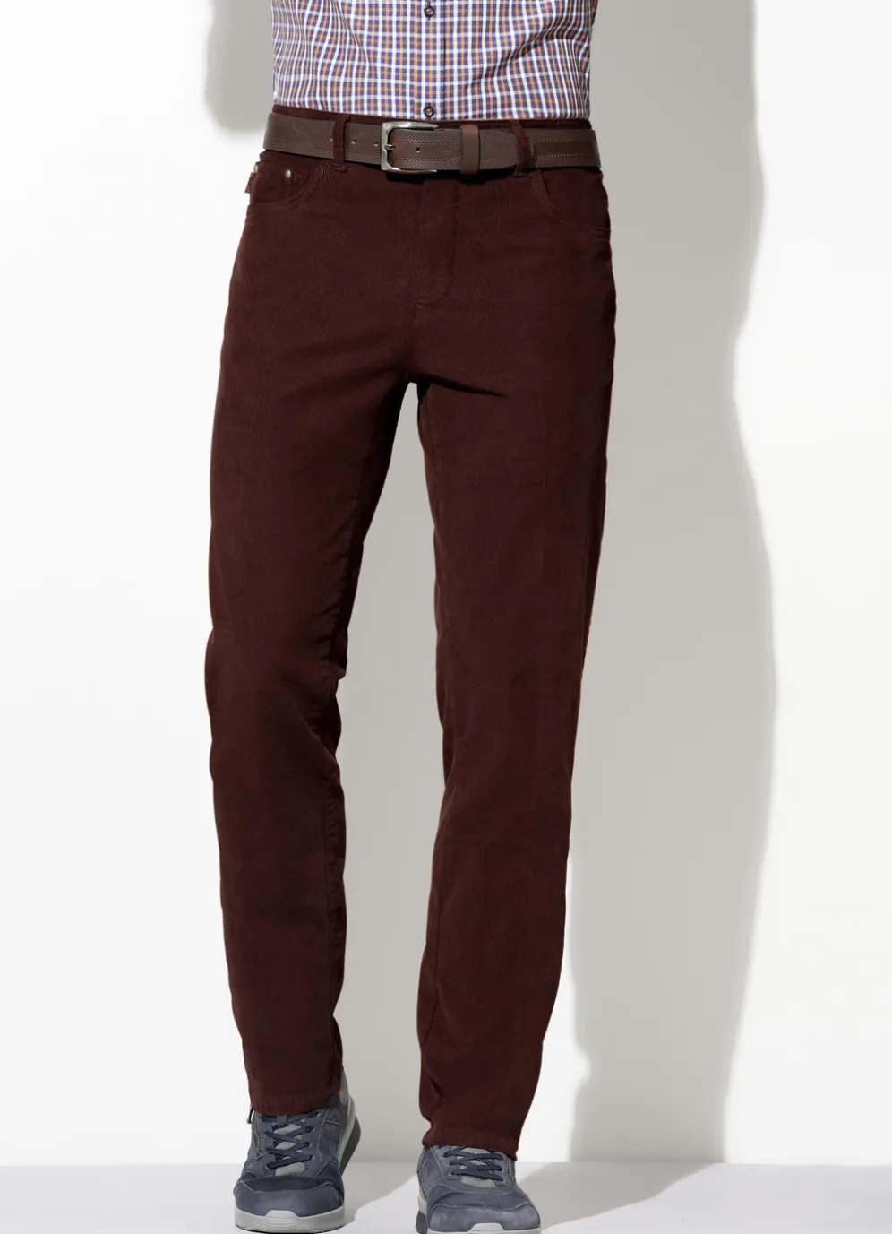 Tolle „Francesco Botti“-Cordhose mit Dehnbund, Seitentaschen, Kleingeldtasche mit Nietenzier sowie Gesäßpaspeltaschen mit Knopfverschluss.