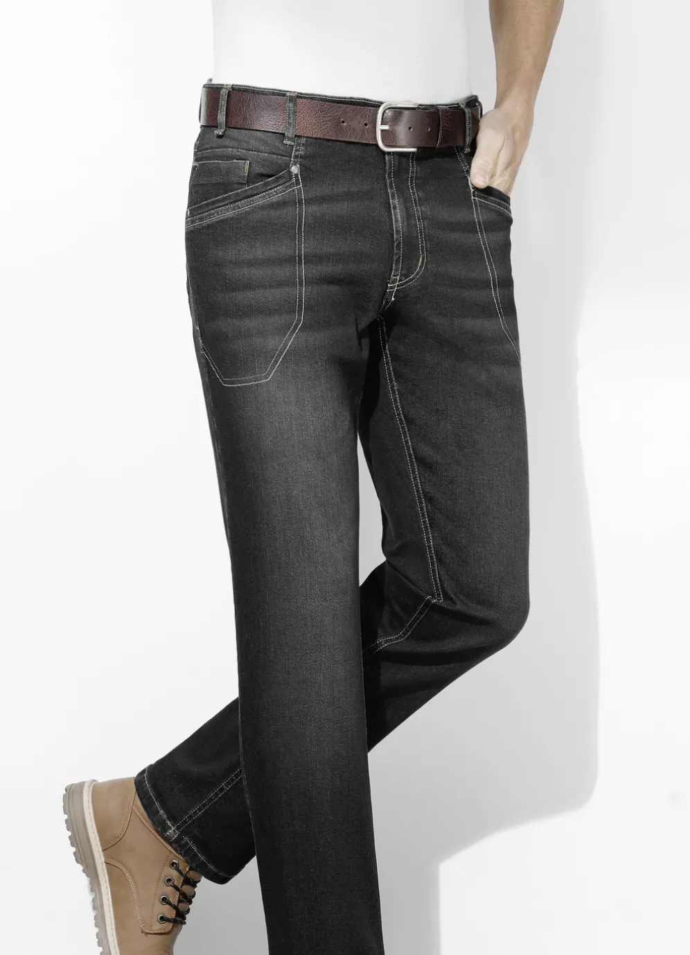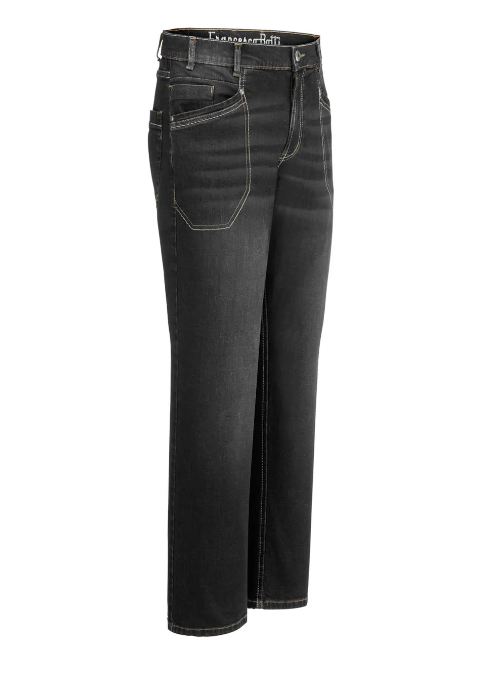 „Francesco Botti”-Jeans: Seitentaschen mit Nietenzier, Kleingeldtasche, Kontrastziernähte, Jeanssattel sowie aufgesetzte Gesäßtaschen mit Ziersteppung.