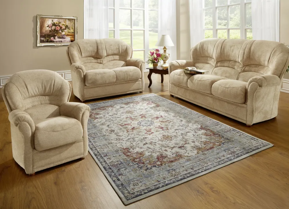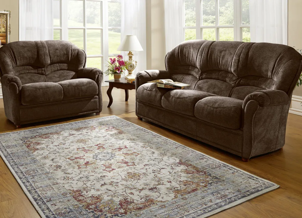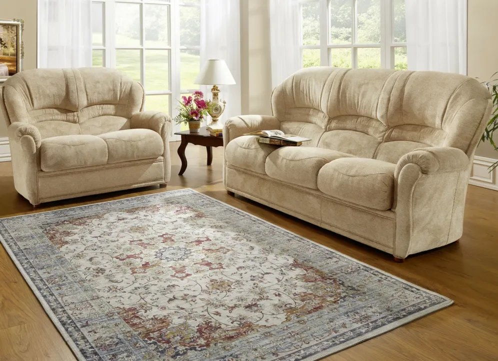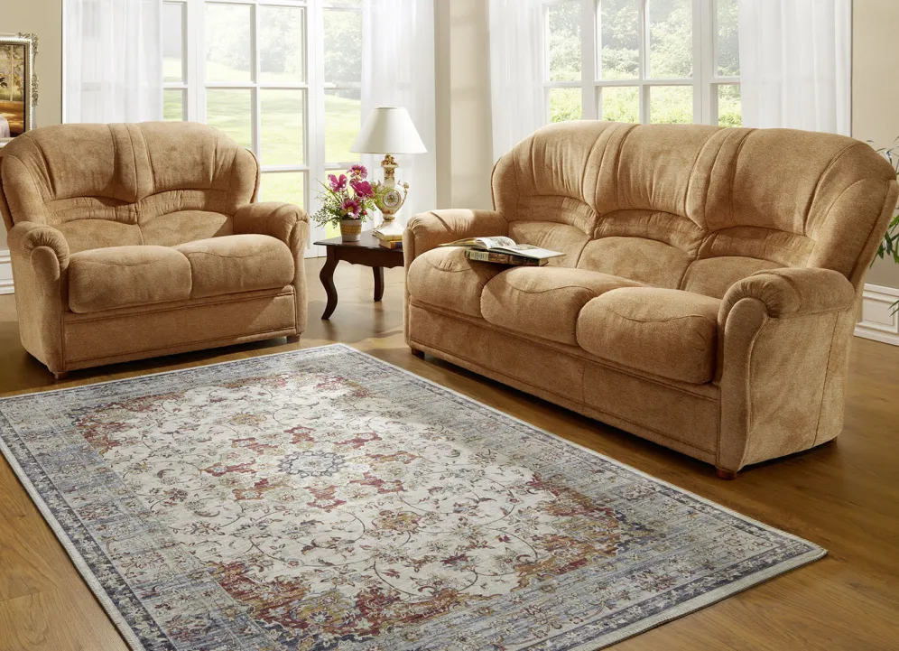 Geschmackvolle und komfortable Polstermöbel mit apartem Stoffbezug (100% Polyester). Auf stabilem Holzgrundgestell, mit bequemer Polsterung sowie wertvoll gestepptem Rücken. Die Sitzkissen sind einzeln herausnehmbar. Rücken echt, daher frei im Raum aufstellbar. Maße: je Höhe 100 cm; Sitzhöhe 46 cm, Sitztiefe 48 cm