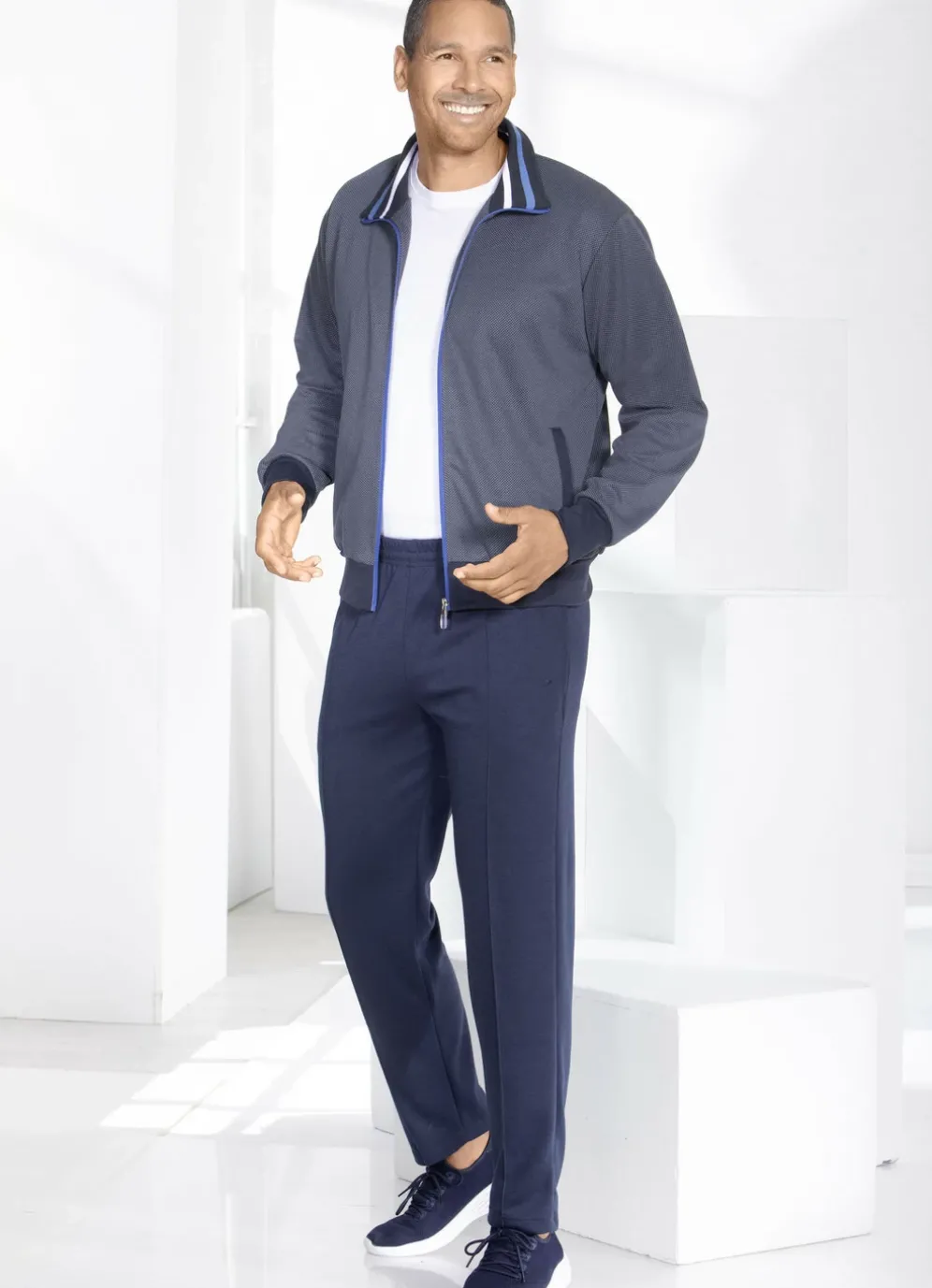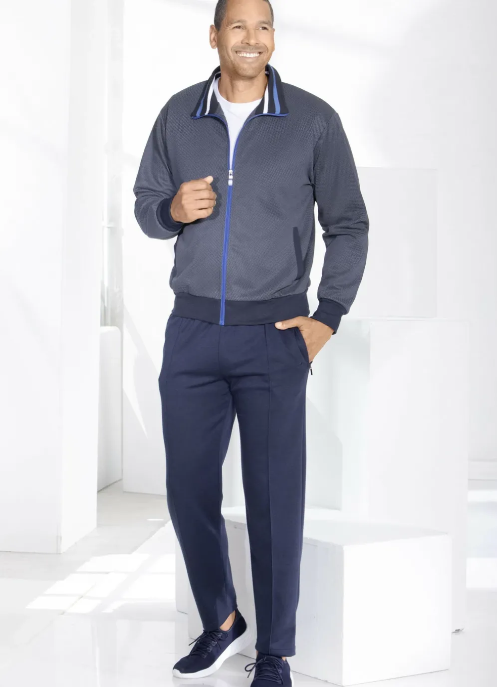 Sportiver Freizeitanzug in Marine mit Seitentaschen, elastischen Ärmelabschlüssen sowie elastischem Bund. Hose mit Kordelzug im Dehnbund, zwei Reißverschluss-Taschen und Biesennaht.