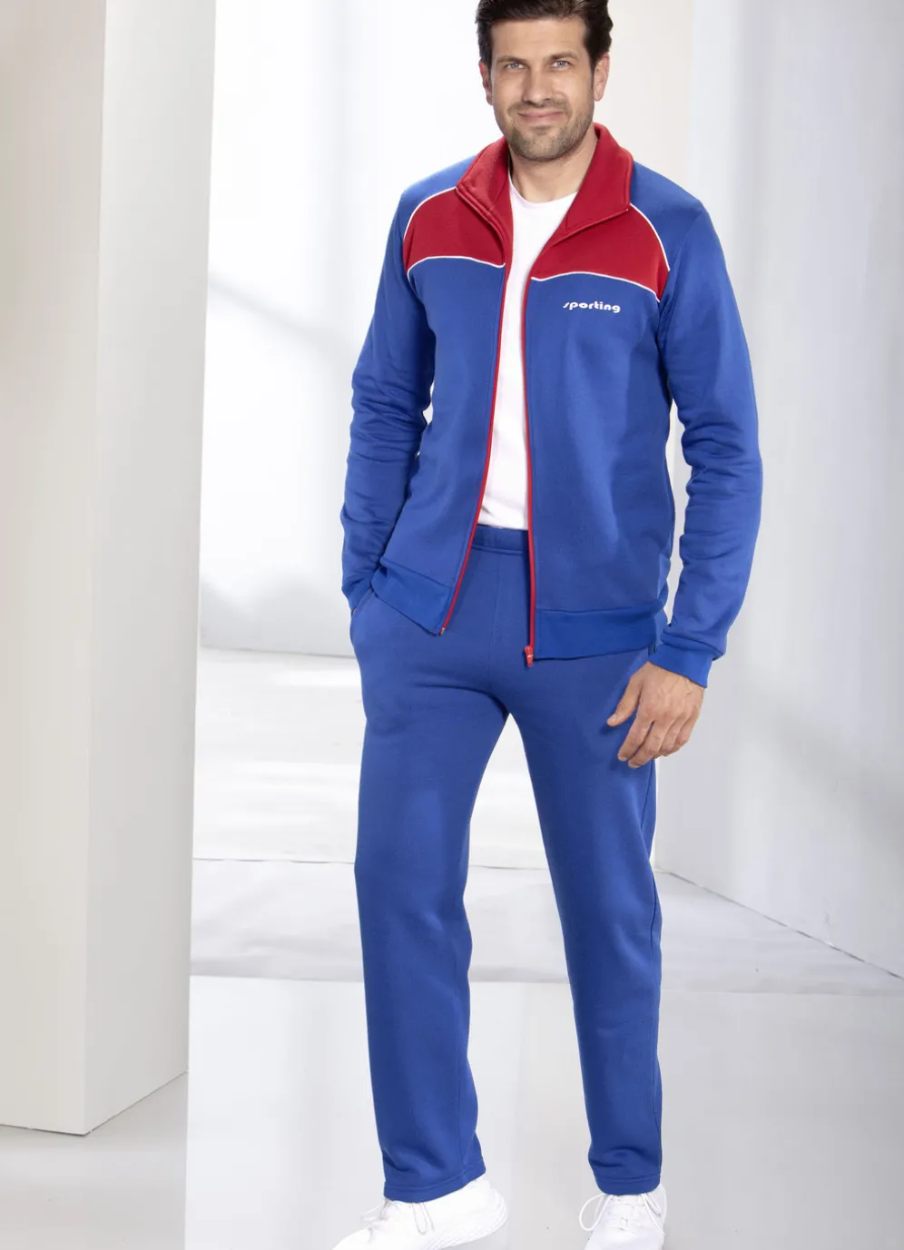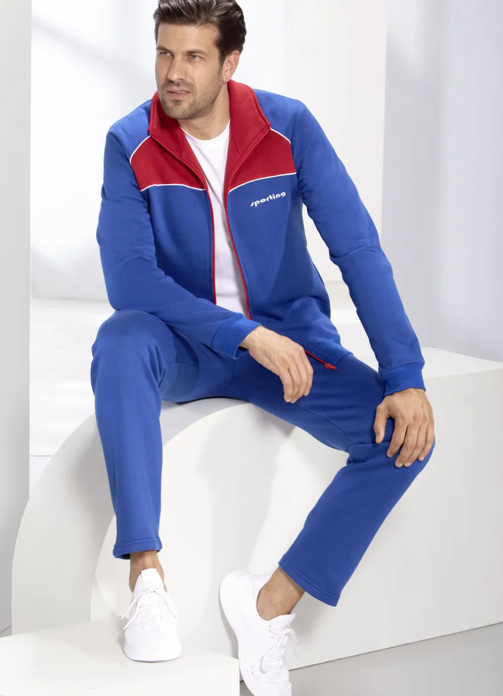 Freizeitanzug in Royalblau-Rot. Oberteil mit Stickerei links, Seitentaschen sowie elastischen Ärmelabschlüssen. Hose mit Kordelzug im Dehnbund, Seitentaschen und geraden Beinabschlüssen.