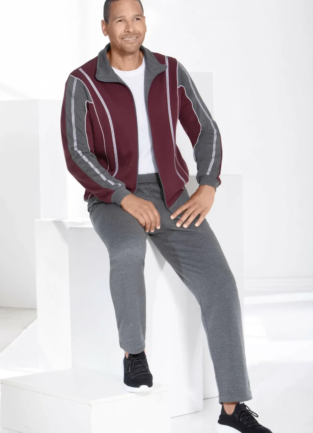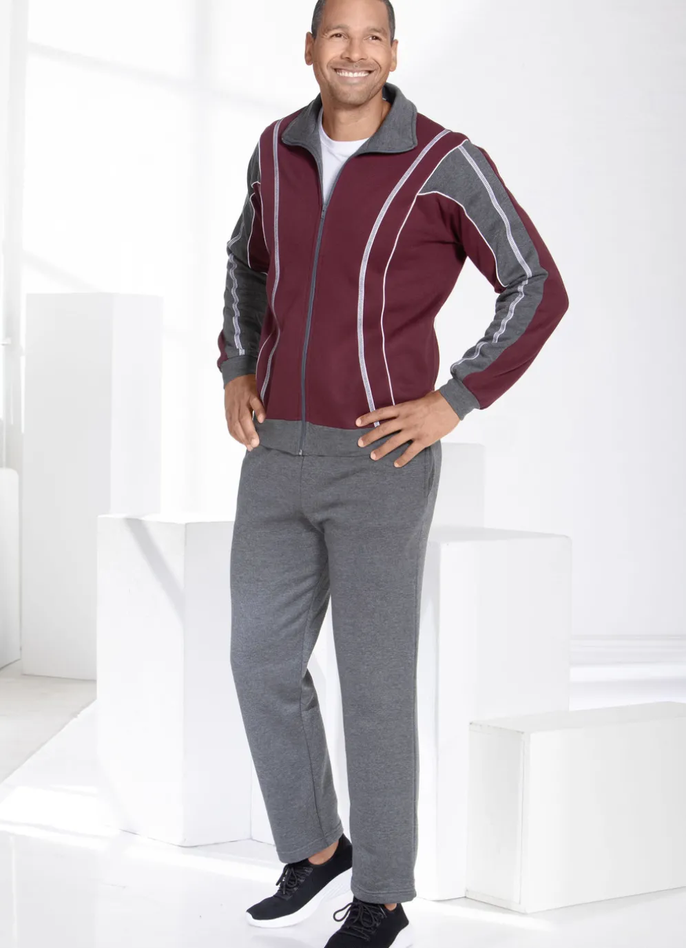Freizeitanzug mit elastischen Ärmelabschlüssen in Bordeaux-Anthrazit Meliert und in Größe 48.