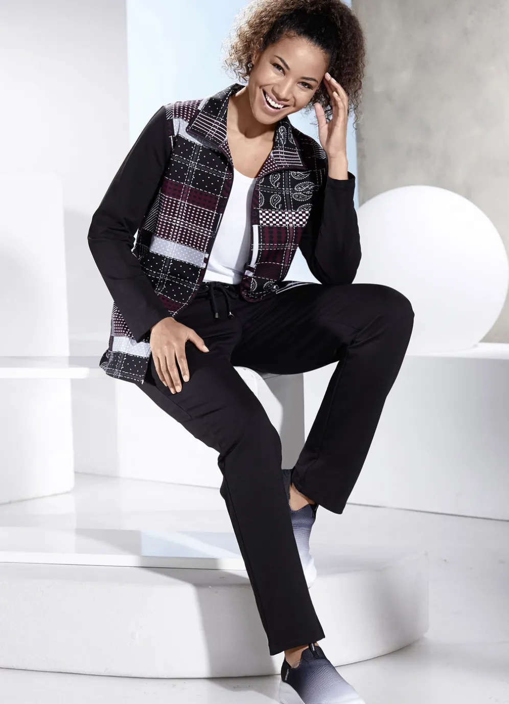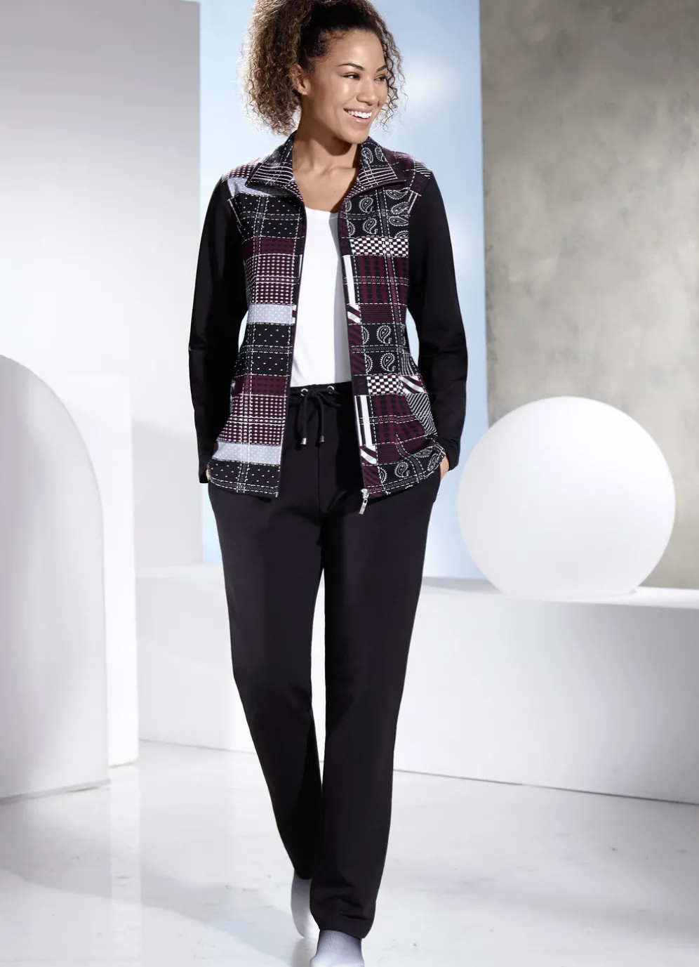 Freizeitanzug mit Seitentaschen in Schwarz-Beere und in Größe 38.